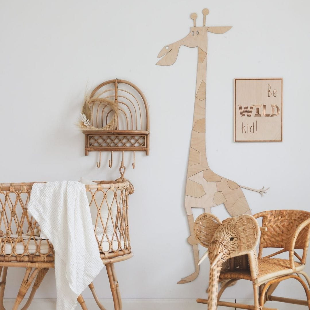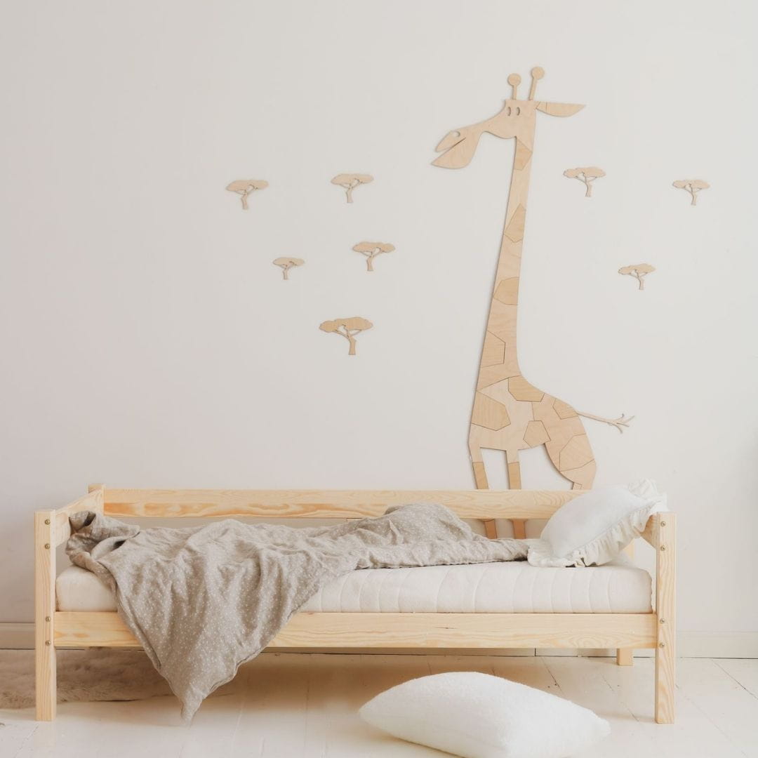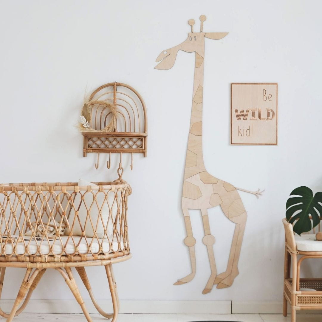 Żyrafa jest wykonana ze sklejki brzozowej o grubości 3mm. Dzięki naturalności zwierzaków z łatwością dopasujesz je do każdego dziecięcego wnętrza.