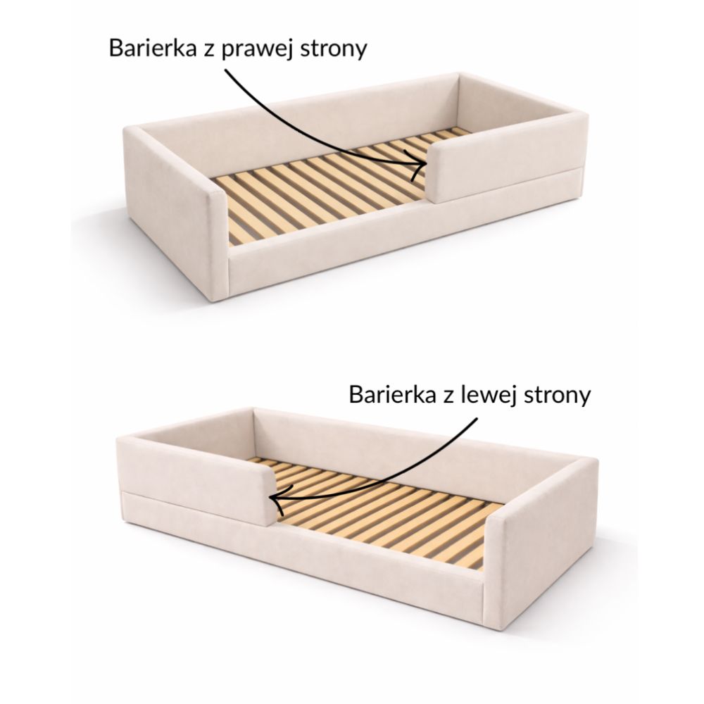 Dla zwiększenia bezpieczeństwa łóżko zostało wyposażone w miękką ramę o grubości 5 cm oraz praktyczną barierkę ochronną o wysokości 30 cm, która zabezpiecza dziecko przed zsunięciem się podczas snu. Niska konstrukcja umożliwia maluchowi samodzielne wchodzenie i schodzenie z łóżka.