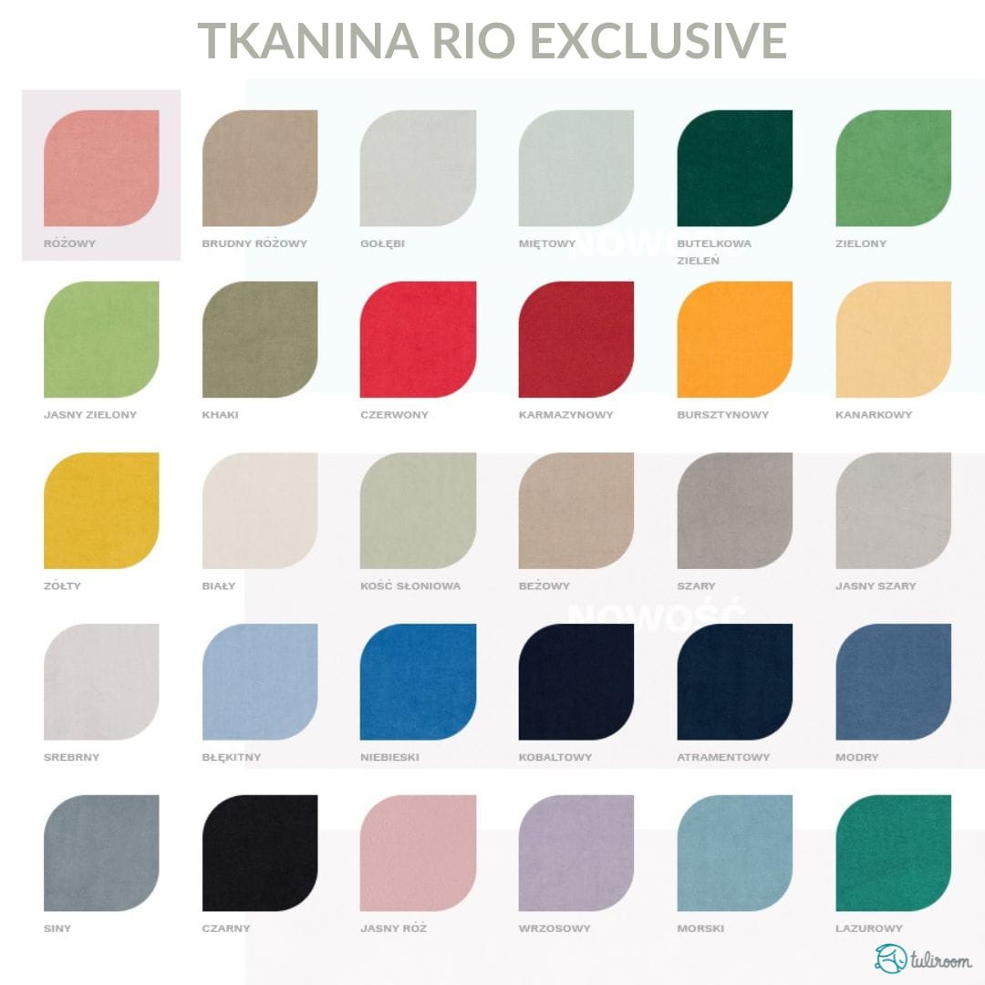 Tkanina Rio (tkanina exclusive) – gramatura 300g/m2, odporność na ścieranie 60000, tkanina o puszystej pokrywie włosowej, miękka i niezwykle przyjemna w dotyku. Efektownie cieniuje odbijając padające światło. Ogranicza wchłanianie wody, jest plamoodporna i ma właściwości trudnopalne.