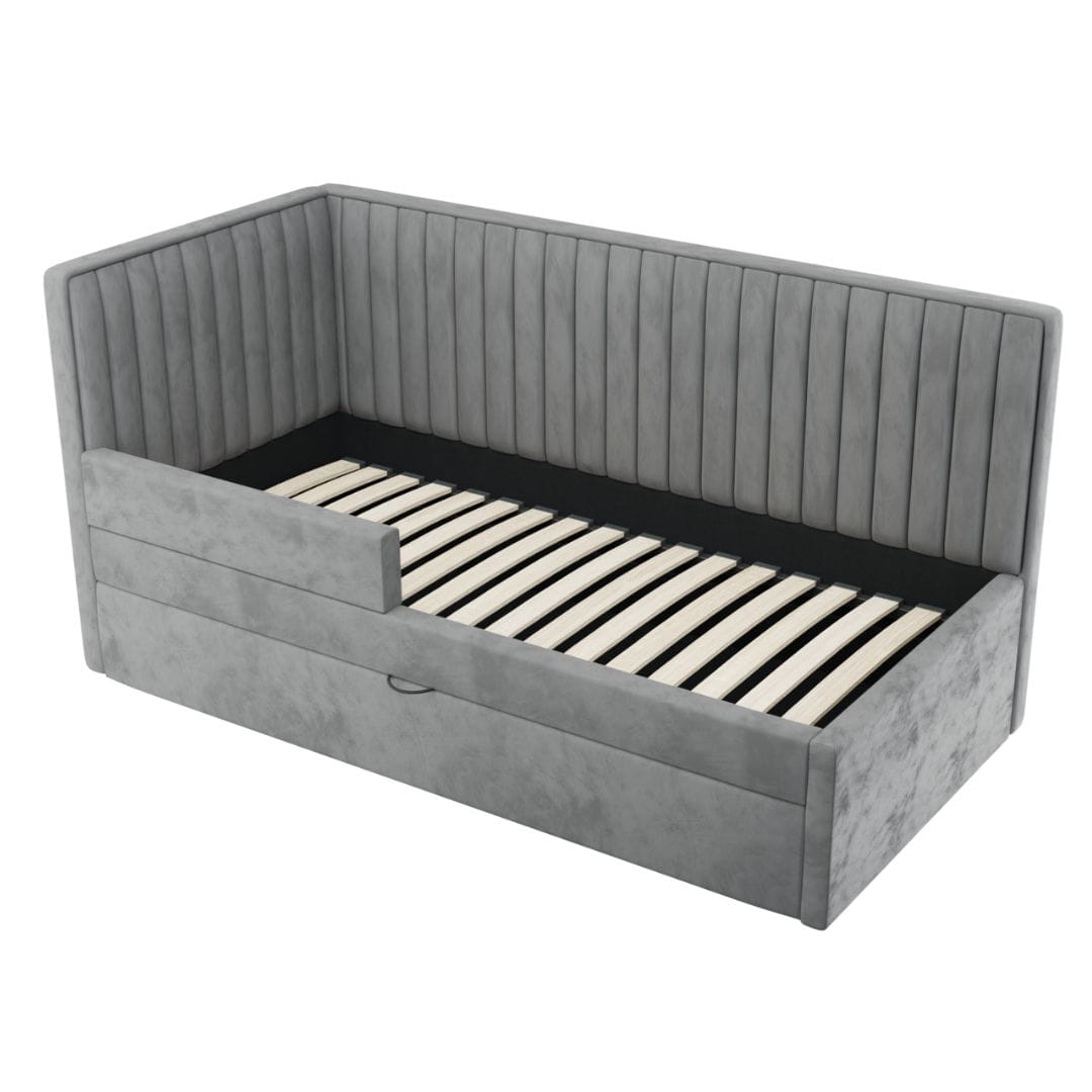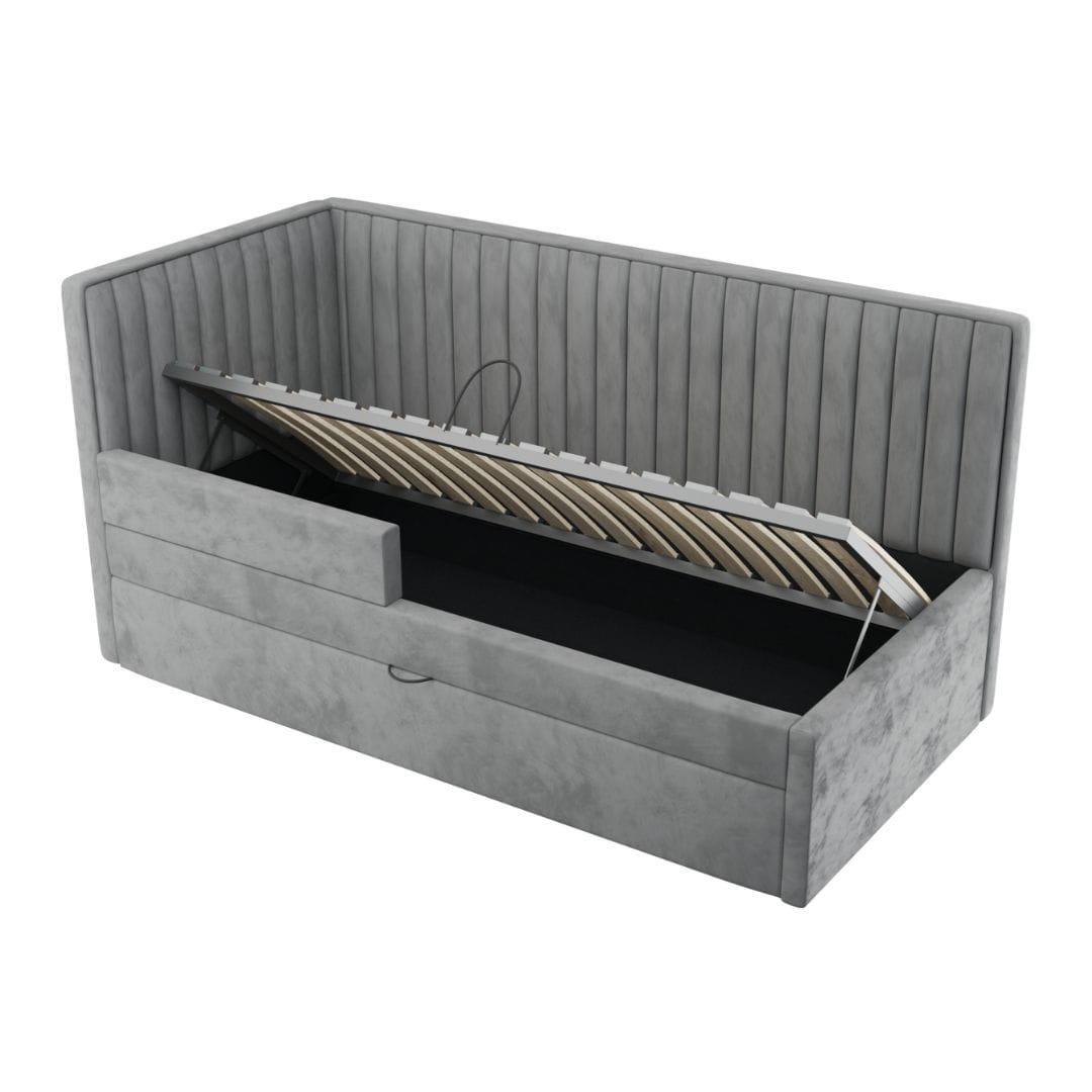 Łóżko tapicerowane dziecięce występuje w różnych szerokościach stelaży 80, 90, 100, 120, 140 cm i długości 200 cm. Wybrany rozmiar łóżka = rozmiar materaca. Łóżka posiadają stelaż premium z metalową ramą, podnośnikami gazowymi dobranymi do odpowiedniego rozmiaru łóżka oraz drewnianymi listwami sprężynującymi. Wnętrze łóżka tapicerowane jest czarną tkaniną hydrofobową, dodatkowo okucia i podpórki są malowane na czarno.