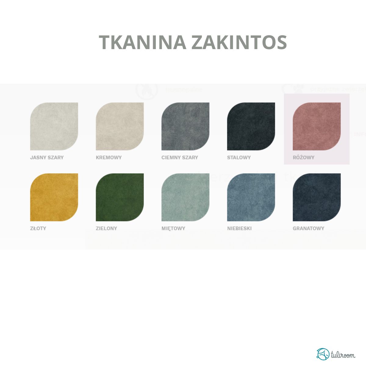 Tkanina Zakintos (premium) - gramatura 350g/m2, odporność na ścieranie 45000, velvet o subtelnym efekcie marmurku, bardzo miękki i przyjemny w dotyku. Charakteryzuje się utrudnionym wchłanianiem płynów, łatwym czyszczeniem wodą oraz wysoką odpornością na zadrapania i zaciągnięcia, dzięki czemu doskonale sprawdza się w domach ze zwierzętami. Dodatkowo została zabezpieczona powłoką antybakteryjną, przeciwwirusową i przeciwgrzybiczną.
