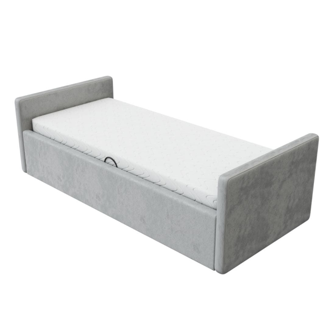 Szuflada wykonana jest z otapicerowanej tkaniną hydrofobową płyty MDF, zawiera otwory wentylacyjne pod materac. Materac do szuflady musimy dobrać o 10 cm krótszy na długość i szerokość od stelaża łóżka.