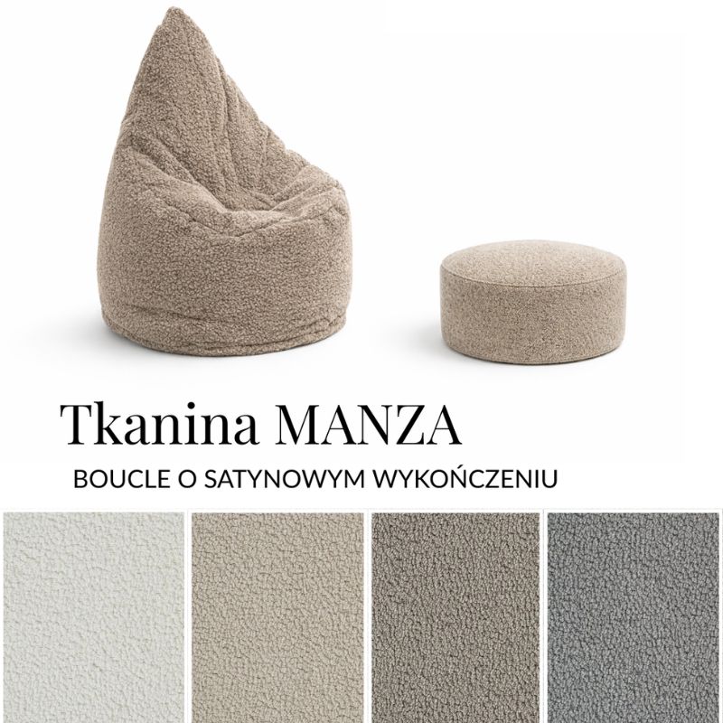 Wyjątkowa tkanina Manza to luksusowa dzianina typu boucle o subtelnym, satynowym wykończeniu, która nadaje pufie niepowtarzalnej tekstury i elegancji. Jej miękka, „barankowa” struktura jest niezwykle przyjemna w dotyku, dzięki czemu tworzy w pokoju dziecka atmosferę przytulności i wyrafinowanego stylu.