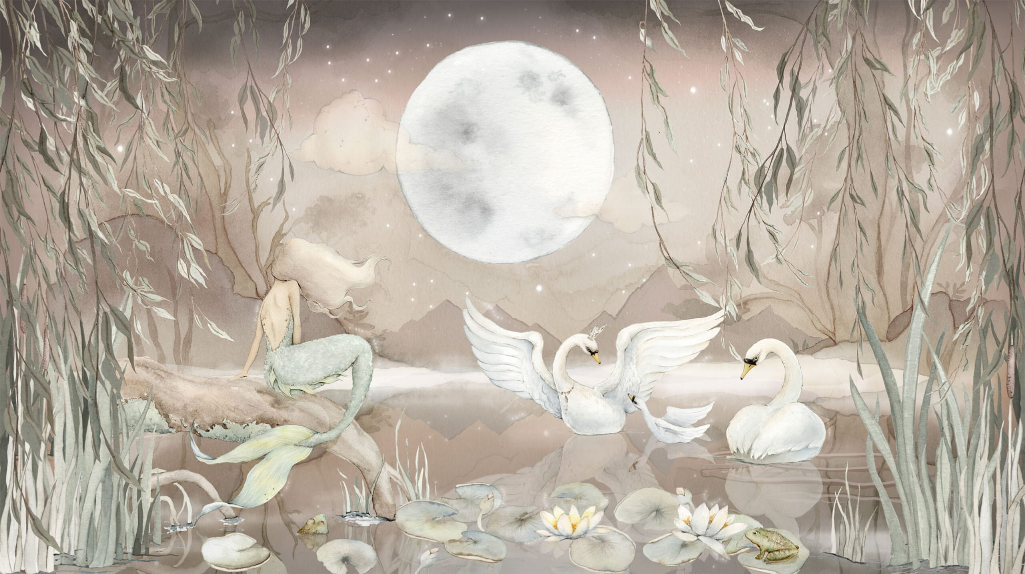 Mural Mermaid Lake jest idealnym wyborem do pokoju dziewczynki, która pragnie otaczać się magią syren i łabędzi. Doskonale sprawdzi się w aranżacjach inspirowanych wodą, naturą oraz baśniowym światem. Pięknie komponuje się z pastelowymi kolorami, nadając wnętrzu lekkość i subtelny urok. To wybór, który wprowadzi do pokoju atmosferę ciepła, magii i spokoju.