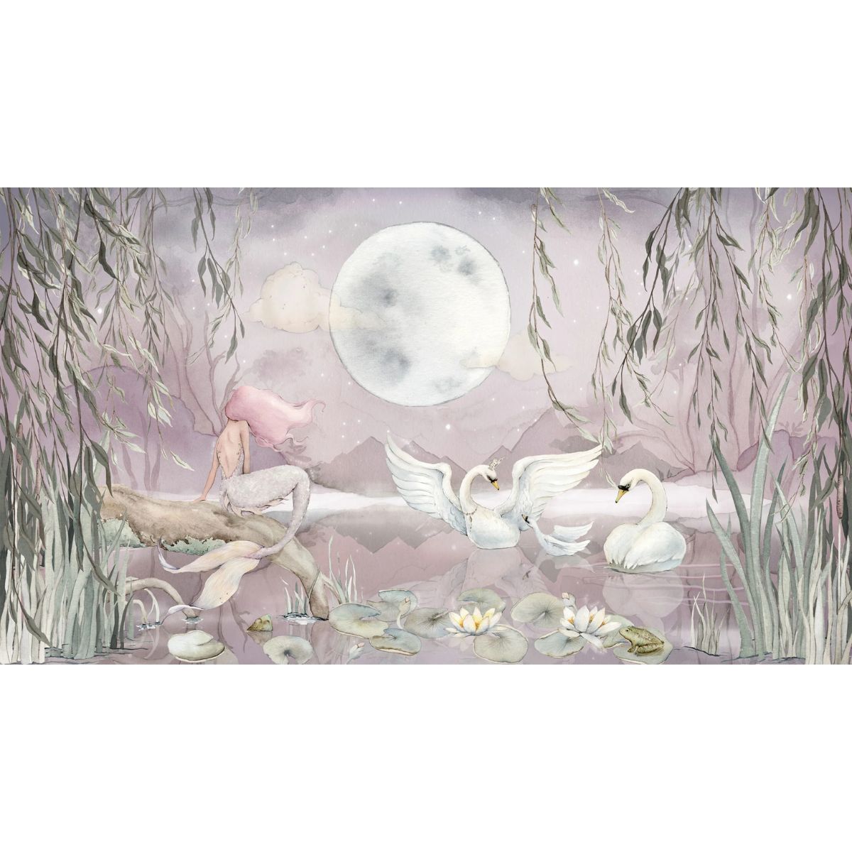 Mural Mermaid Lake jest idealnym wyborem do pokoju dziewczynki, która pragnie otaczać się magią syren i łabędzi. Doskonale sprawdzi się w aranżacjach inspirowanych wodą, naturą oraz baśniowym światem. Pięknie komponuje się z pastelowymi kolorami, nadając wnętrzu lekkość i subtelny urok. To wybór, który wprowadzi do pokoju atmosferę ciepła, magii i spokoju.
