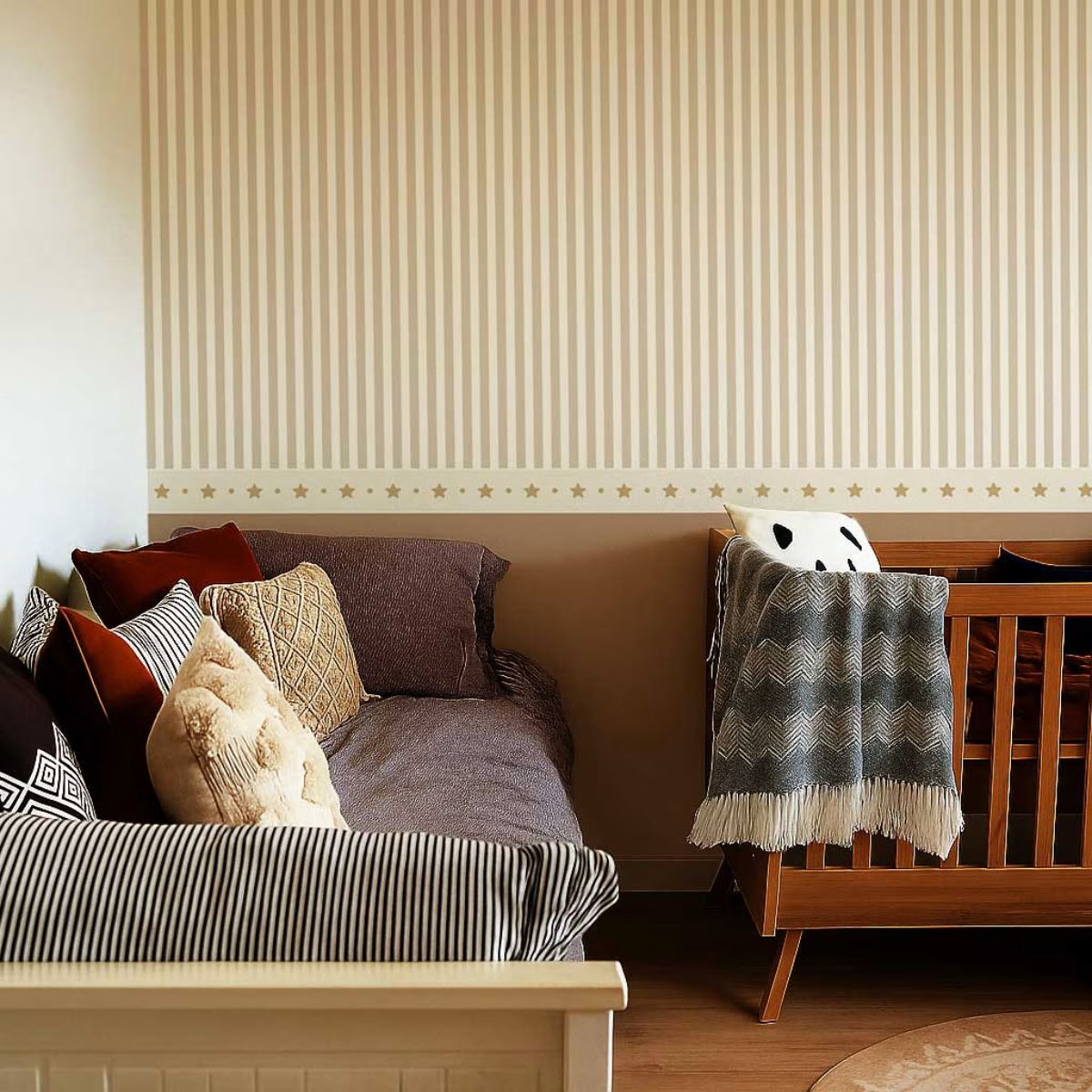 Tapeta w drobne paski z karmelową lamperią to elegancka i ciepła propozycja do pokoju dziecka, inspirowana klasycznym stylem skandynawskim. Połączenie subtelnych, pionowych pasków z gładką, karmelowo-brązową lamperią tworzy harmonijny i uporządkowany efekt. Dzięki temu wnętrze staje się przytulne, a jednocześnie estetyczne i pełne stylu.