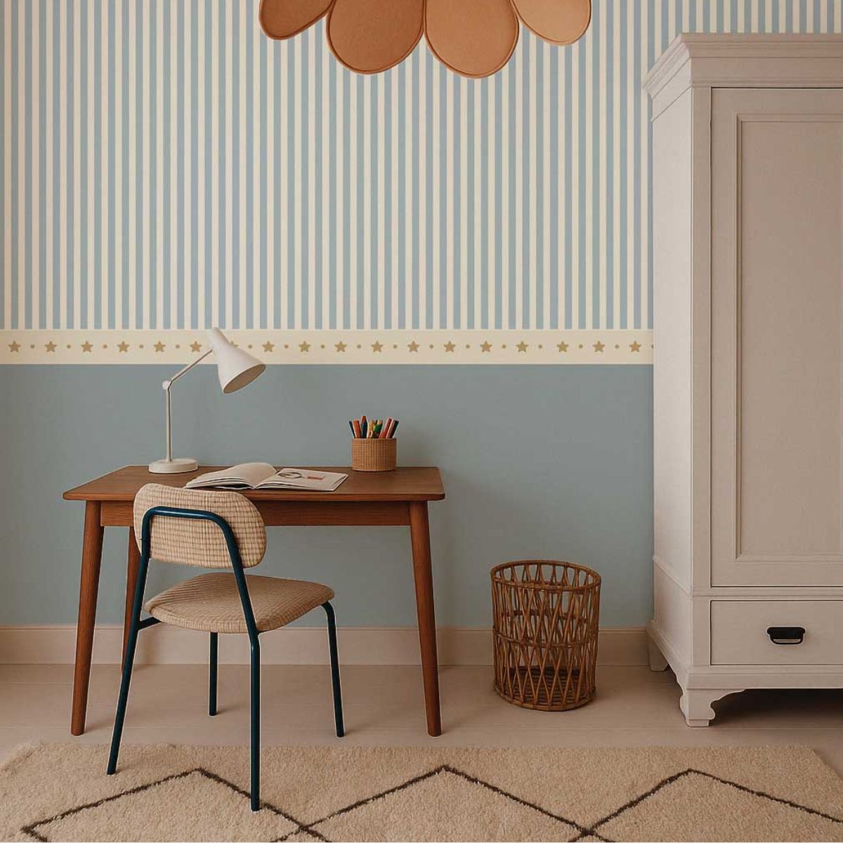 Tapeta w drobne paski z niebieską lamperią to subtelne i ponadczasowe połączenie klasyki z dziecięcą lekkością. Jasne, pionowe paski dodają wnętrzu przestronności, a stonowana niebieska lamperia wprowadza spokój i harmonię. Ten mural do pokoju dziecka pięknie porządkuje przestrzeń i nadaje jej przytulny, uporządkowany charakter.