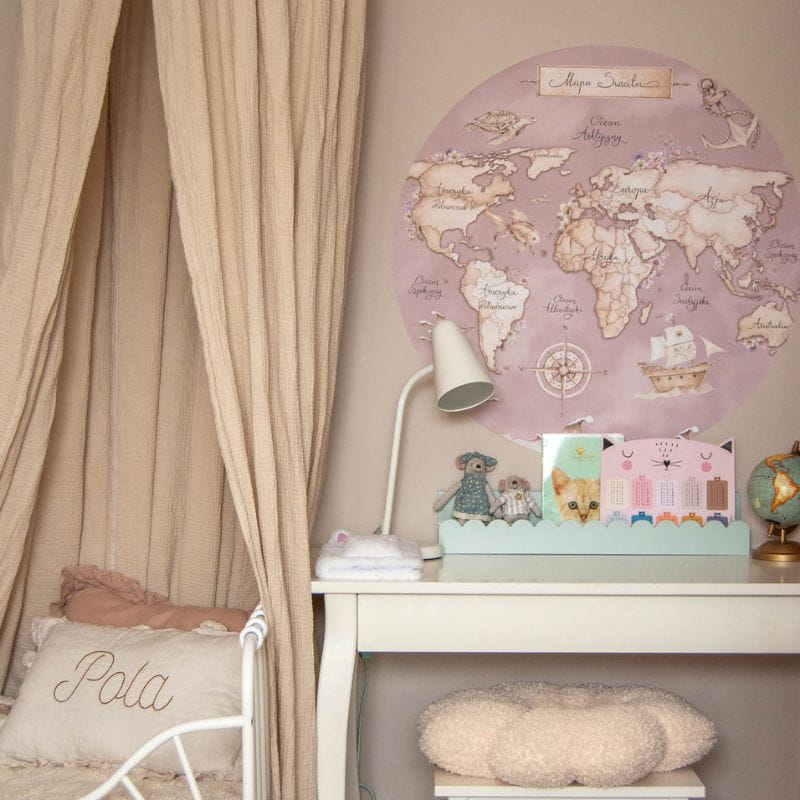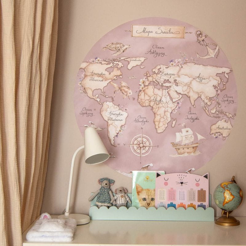Naklejka z mapą świata w dziewczęcym wydaniu? Oto i ona. Posiada kształt koła, można zatem powiedzieć, że stanowi okno, przez które dziecko może odbyć wiele „wojaży”, zwłaszcza tych po krainie wyobraźni. Pewne jest to, że rozbudzi ona ciekawość geograficzną, a i wspaniale udekoruje pokoik, wnosząc do niego sporo uroku i elegancji.