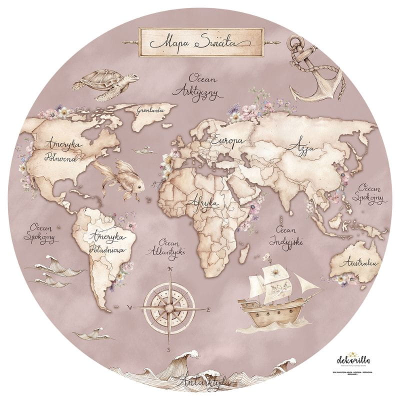 DEKORILLO - NAKLEJKA KOŁO MAPA ŚWIATA MORSKA RÓŻOWA