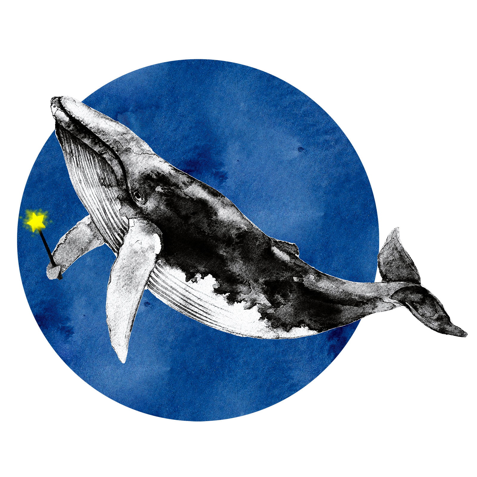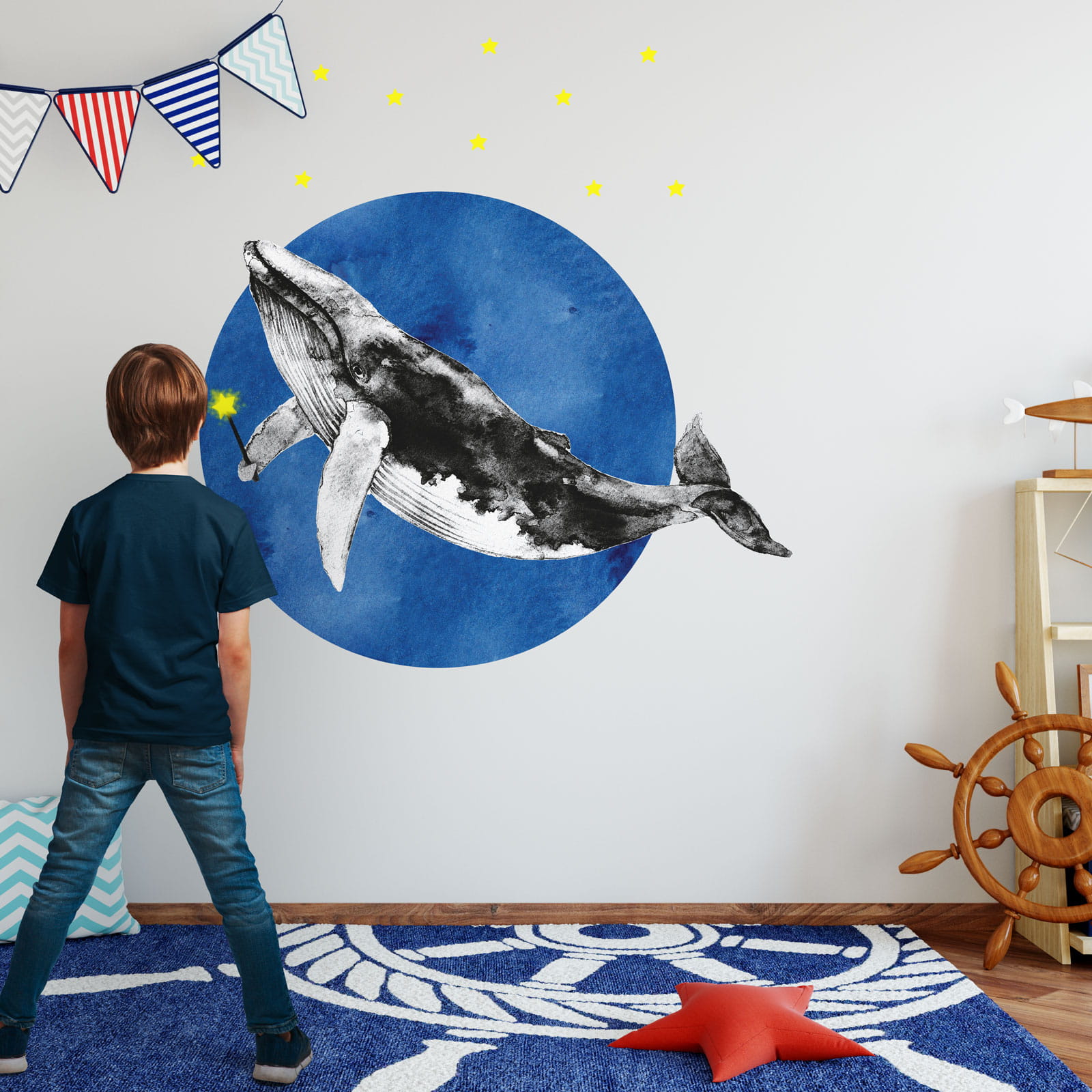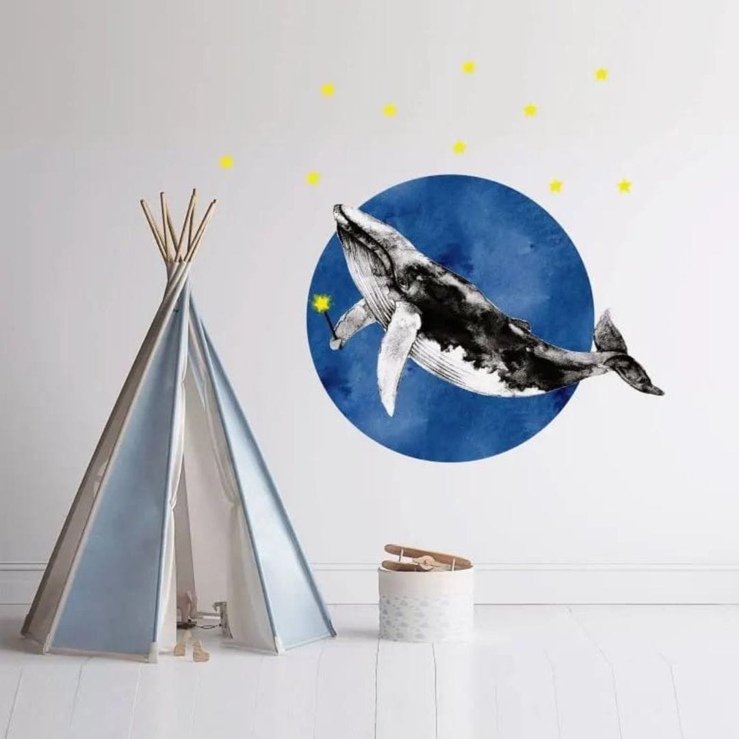 Naklejka na ścianę Magiczny Waleń dla wielbicieli mórz, oceanów oraz morskich stworzeń. Kolekcja będzie wyglądać dobrze zarówno w pokoju dziewczynek, jak i chłopców. Na tle dużego koła, wyglądającego jakby zostało namalowane farbami, Waleń prezentuje się wprost majestatycznie. I do tego ta świecącą różdżka. Kompozycję dopełnia zestaw 20 żółtych gwiazdek (w zestawie).