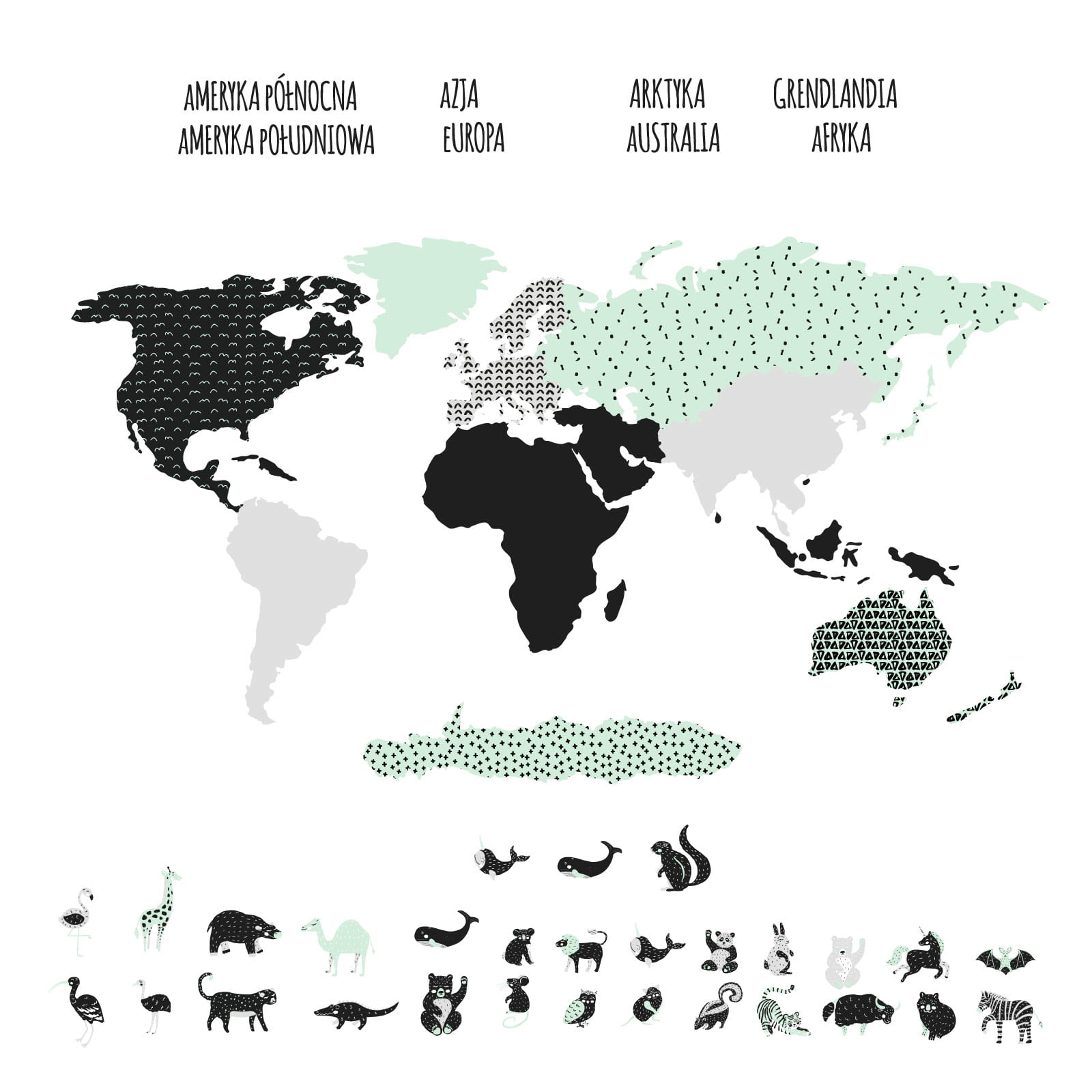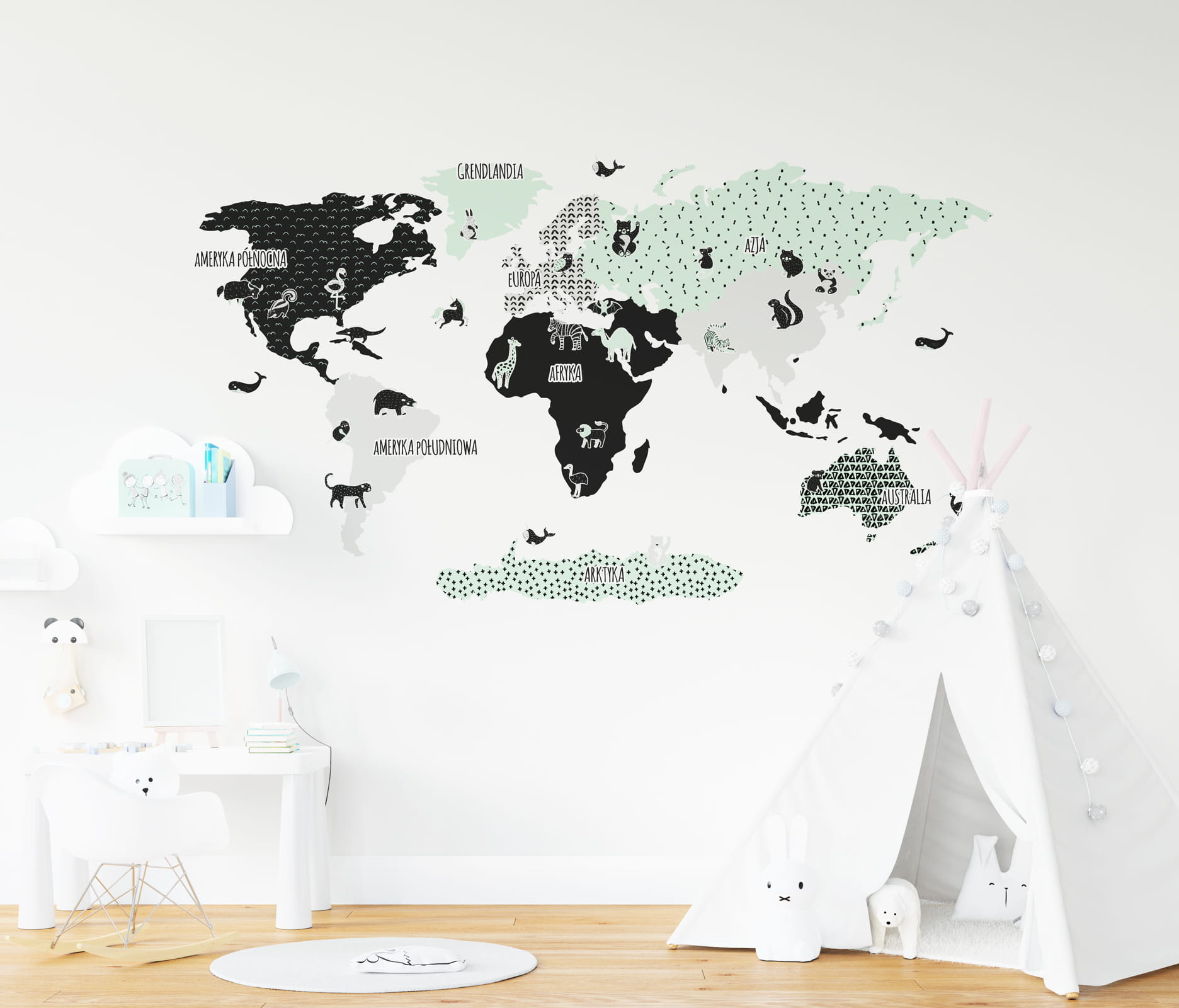 Na zestaw składają się naklejki kontynentów, ich drukowane nazwy oraz set różnych zwierzątek w liczbie aż 29szt. Design naklejki nawiązuje do niezwykle modnego stylu skandynawskiego, który preferuje prostotę w formie i treści. Ta wersja kolorystyczna zdecydowanie dobrze będzie zdobić pokój dziewczynki, jak i chłopca.