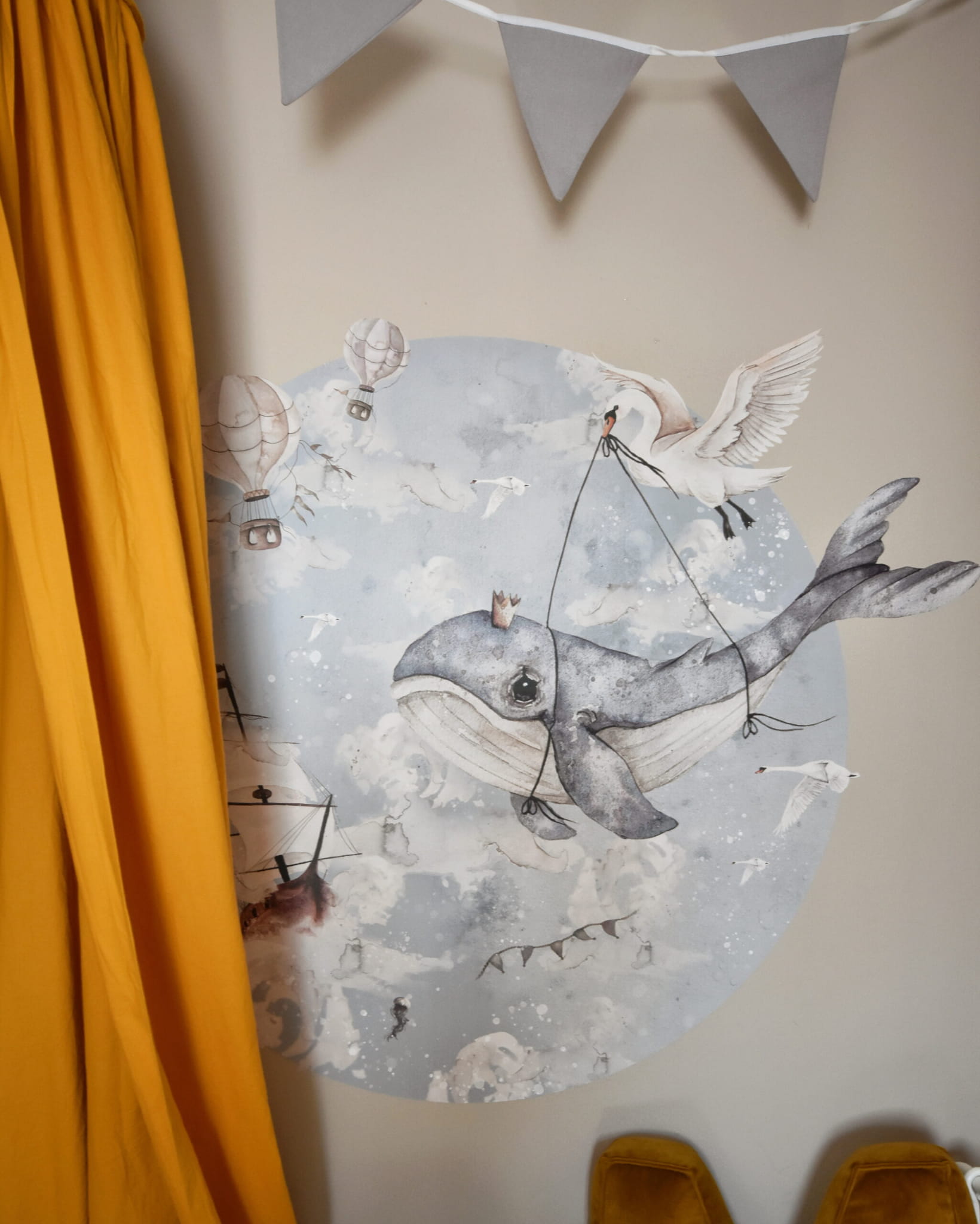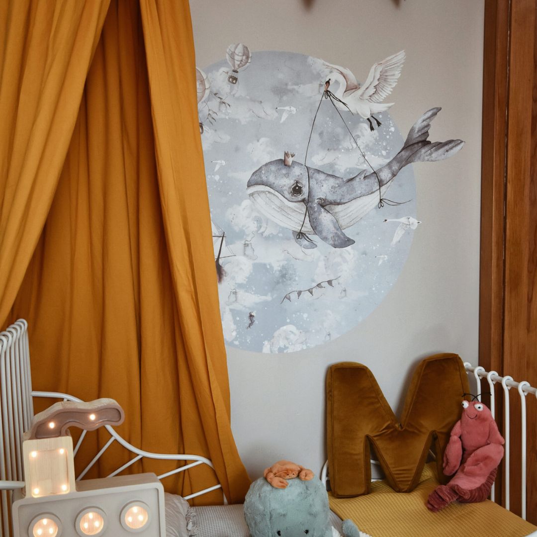Naklejka Podniebny Ocean w kształcie koła swoim wyglądem przypomina morski bąbelek, który jeszcze bardziej podkreśla klimat całości. Naklejkę można wykorzystać jako uzupełnienie tapety z tym samym motywem lub jako osobną dekorację ściany dziecięcego pokoiku. Wystarczy połączyć ją z kolorowymi dodatkami, aby wyczarować wyjątkowe, dziecięce wnętrze.