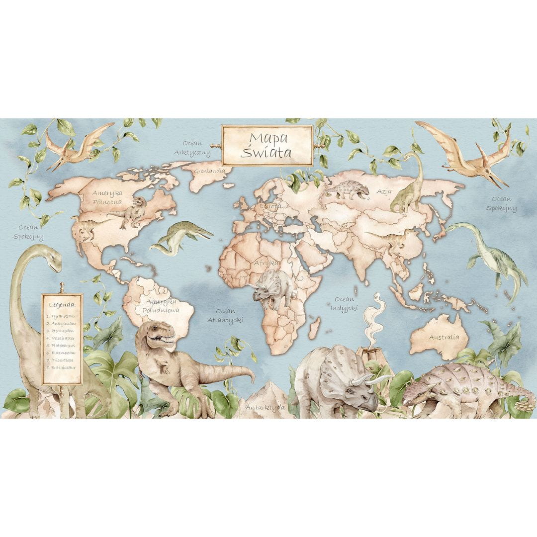 DEKORILLO - PLAKAT MAPA ŚWIATA DINOZAURY NIEBIESKI