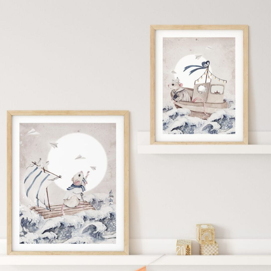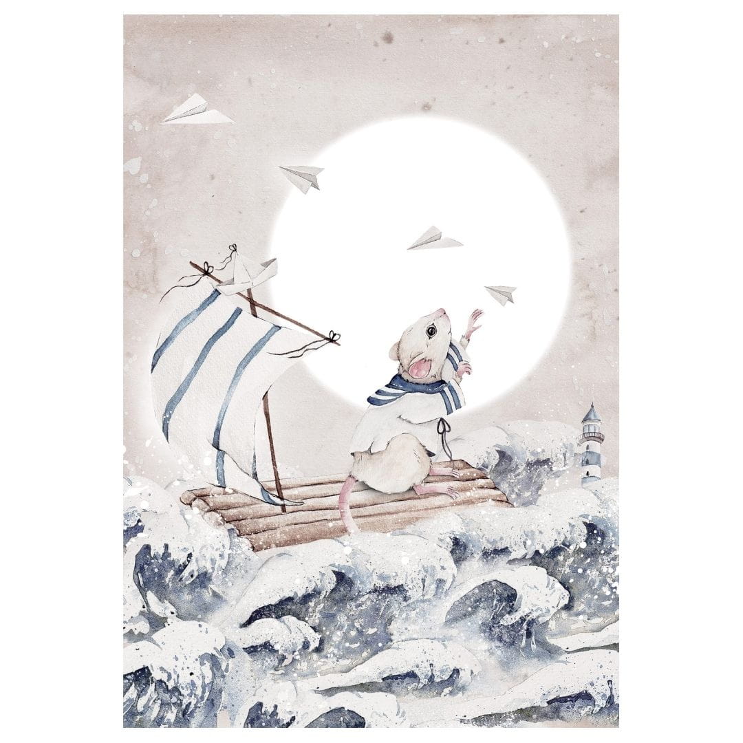 Plakat marynarski z myszką, która wie o przygodach niemal wszystko. I chętnie podzieli się morskimi opowieściami z Twoim maluszkiem! Nawet jeśli na pozór wydają się mało prawdopodobne… Czy Twoja pociecha słyszała o historii białego wieloryba? A o latarniku, który pomaga żeglarzom dotrzeć do portu? Jeśli nie, najwyższa pora to zmienić :)