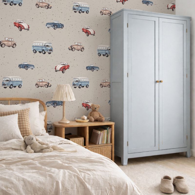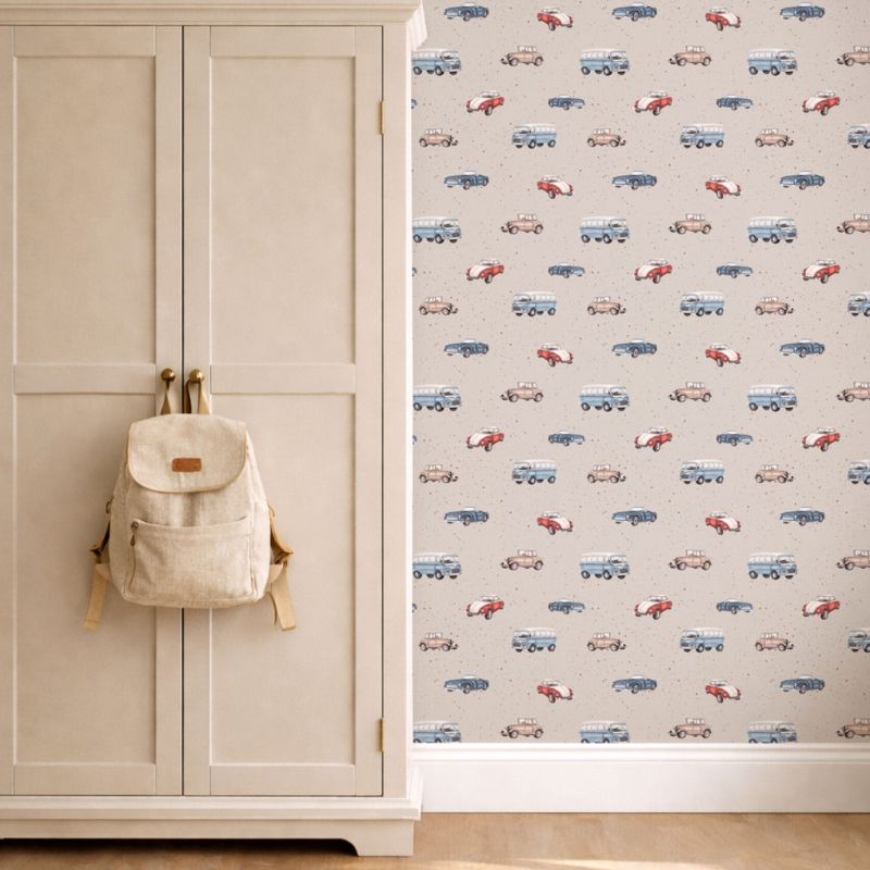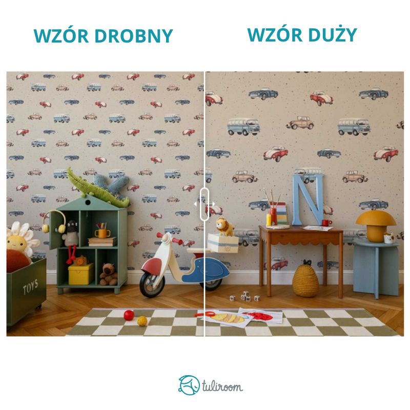 Tapeta w auta to ponadczasowy wzór do pokoju chłopca. Będzie dobrze wyglądać na całej ścianie lub, gdy zestawisz ją z lamperią lub boazerią angielską. Tapeta z samochodami dostępna jest w trzech wariantach kolorystycznych.