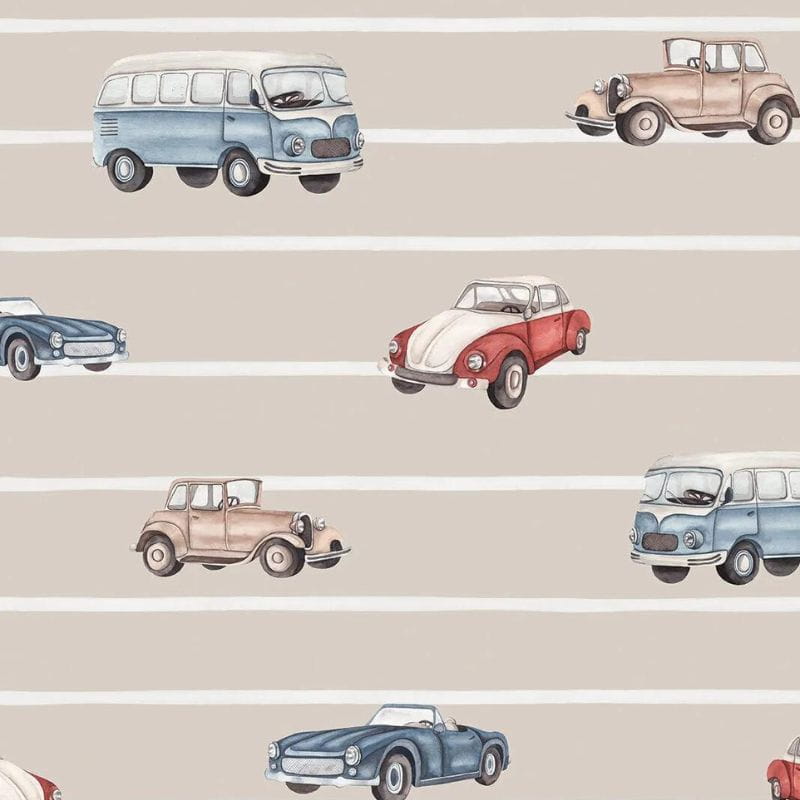 DEKORILLO - TAPETA DLA CHŁOPCA AUTA PASKI BEŻOWA