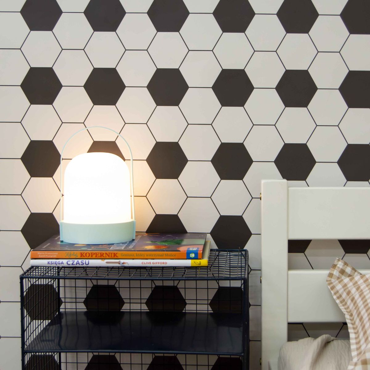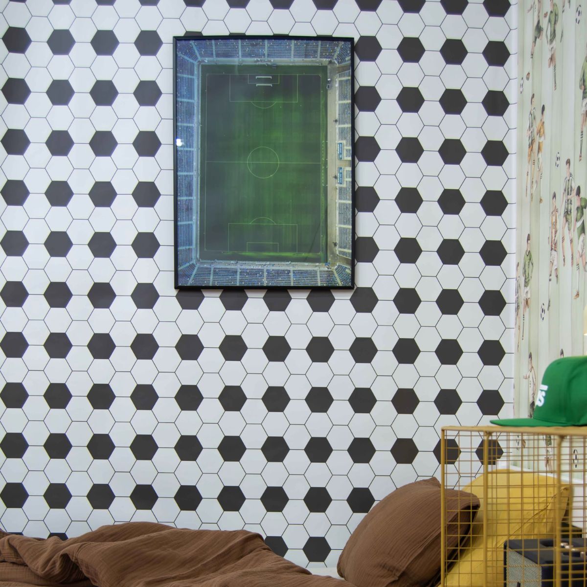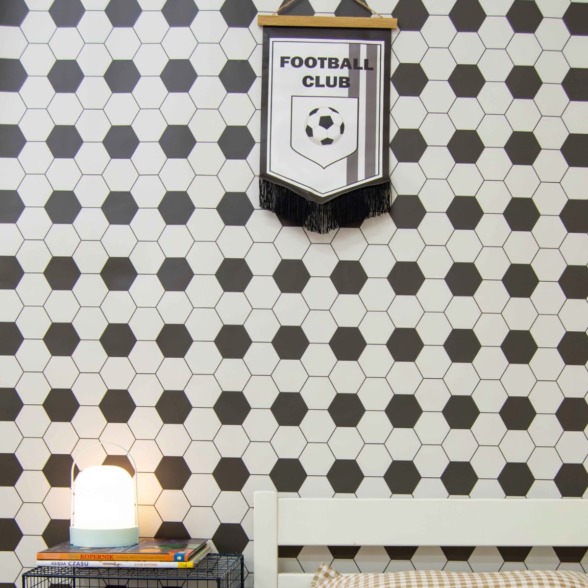Co ważne, wzór heksagonów świetnie sprawdza się również jako uzupełnienie drugiej ściany w pokoju – np. w połączeniu z tapetą z sylwetkami piłkarzy. Takie zestawienie tworzy spójną, tematyczną całość, która nawiązuje do świata sportu, a jednocześnie pozwala zachować estetyczną równowagę i lekkość we wnętrzu.