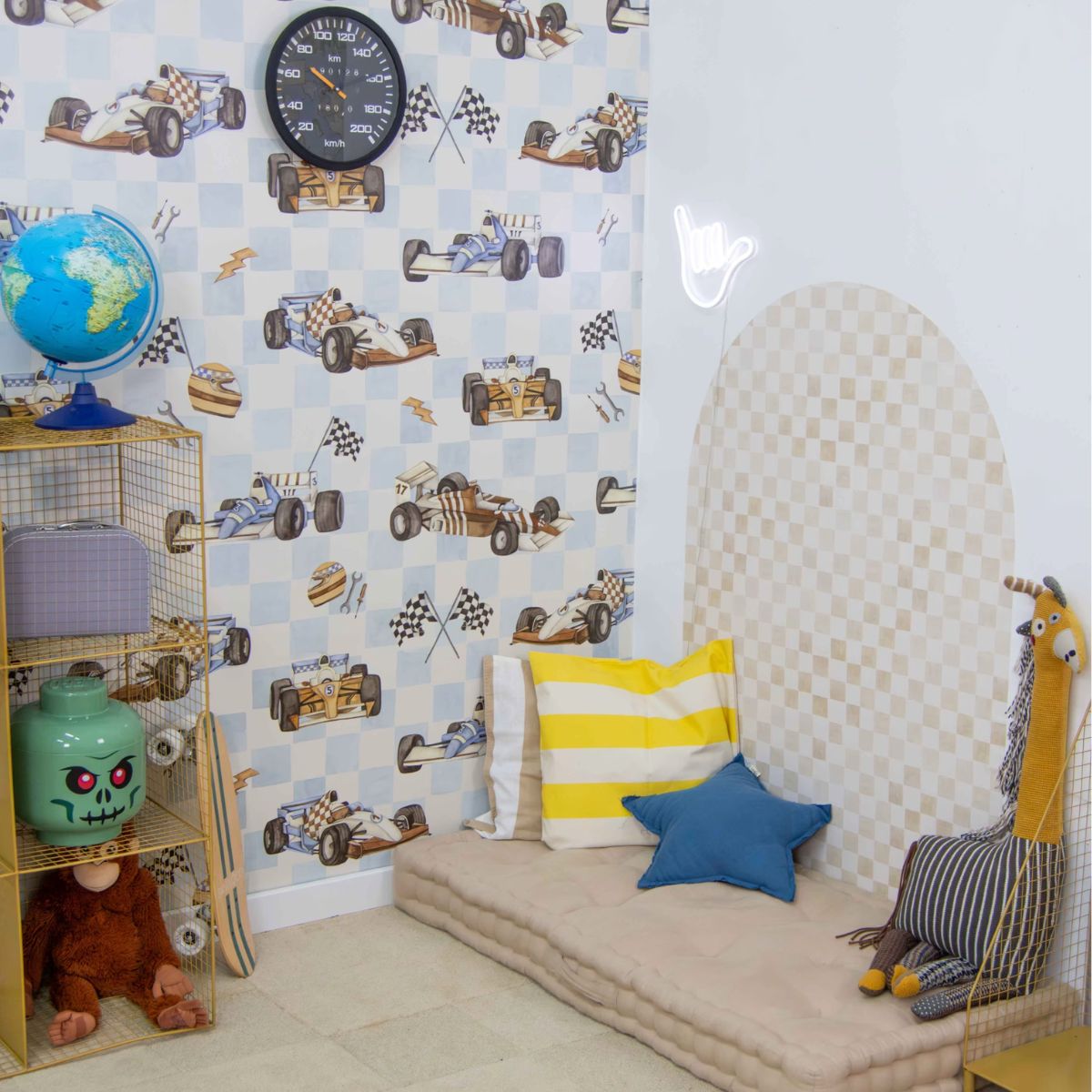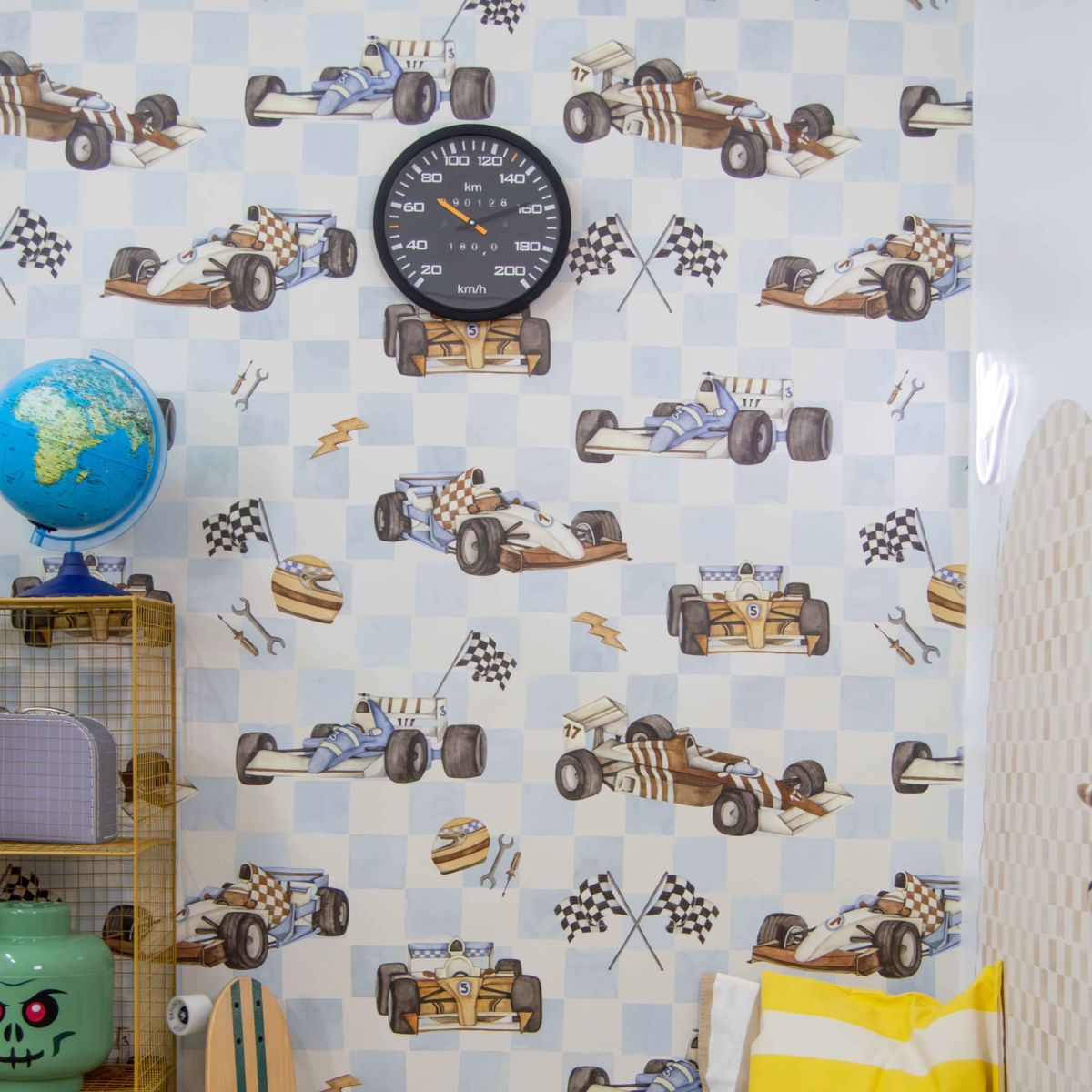 Tapeta z bolidami sprawdzi się znakomicie zarówno jako wyróżniający akcent na jednej ze ścian – na przykład za łóżkiem, biurkiem lub w strefie zabawy – jak i jako motyw przewodni całego pokoju. Dzięki swojej spójnej, ale żywej estetyce pasuje do mniejszych i większych przestrzeni, tworząc w nich atmosferę dziecięcej pasji i energii. To wzór, który rośnie razem z dzieckiem – dynamiczny, ale ponadczasowy, pełen dziecięcego uroku, ale też stylowej prostoty.