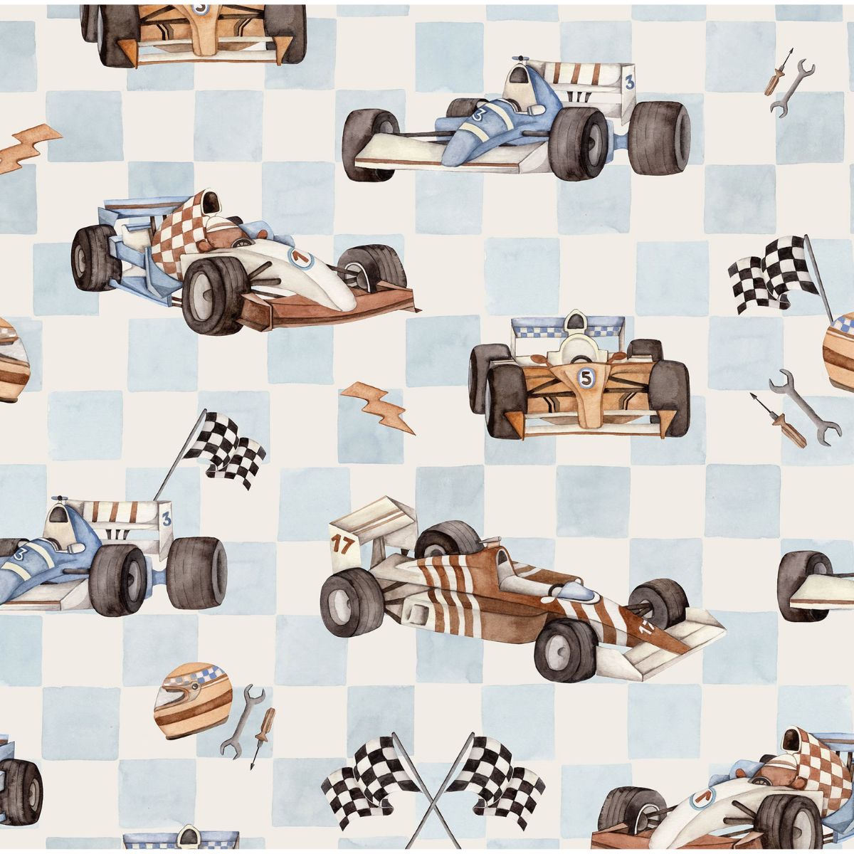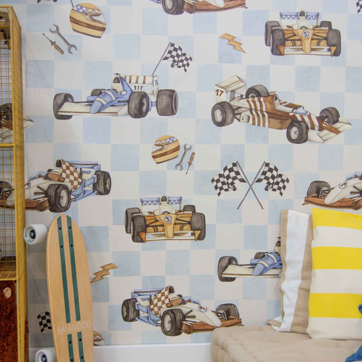 Gotowi na start? Czas wyruszyć w ekscytującą podróż po świecie dziecięcej wyobraźni z tapetą Wyścigówki! To prawdziwe spełnienie marzeń każdego małego miłośnika motoryzacji i szybkiej jazdy. Tapeta łączy w sobie klasyczny urok retro samochodów wyścigowych z dynamicznymi motywami – znajdziemy tu błyskawice, flagi w szachownicę i kaski, które razem tworzą energetyczną, pobudzającą do działania kompozycję. Delikatna błękitna kratka stanowiąca tło całości dodaje tapecie lekkości i świeżości, dzięki czemu wzór nie przytłacza przestrzeni, a jednocześnie przyciąga wzrok i inspiruje do zabawy.