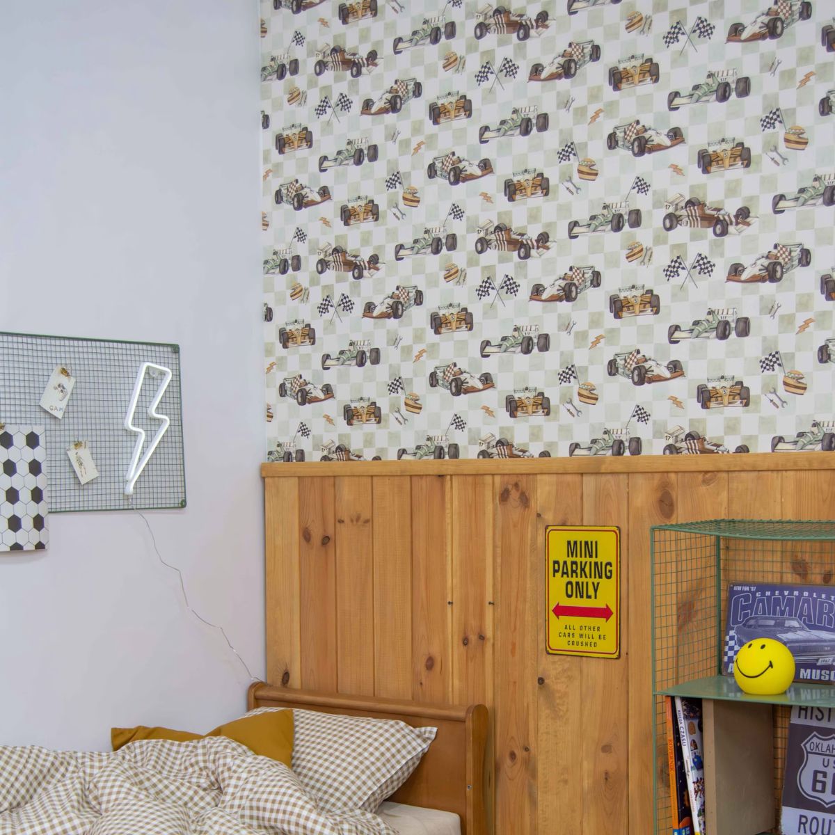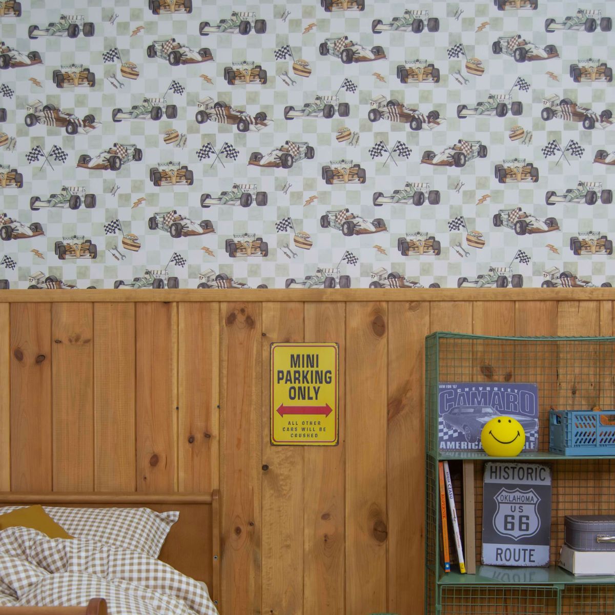 To idealna tapeta do pokoju chłopca, który marzy o torach wyścigowych i szybkiej jeździe. Dzięki zrównoważonej kolorystyce sprawdzi się zarówno w pokoju przedszkolaka, jak i ucznia. Tapeta pięknie komponuje się z drewnem, bielą, szarością i dodatkami w stylu vintage.