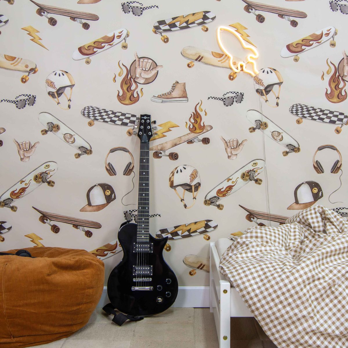 Stonowana, ciepła kolorystyka z dominującym beżem sprawia, że tapeta nie przytłacza przestrzeni, mimo wyrazistego motywu. Dzięki temu świetnie komponuje się z wieloma aranżacjami – od nowoczesnych po bardziej surowe, industrialne wnętrza. Motyw skate idealnie wpisuje się zarówno w potrzeby młodszych dzieci, jak i starszych chłopców, tworząc przestrzeń sprzyjającą wyrażaniu siebie i rozwijaniu pasji.