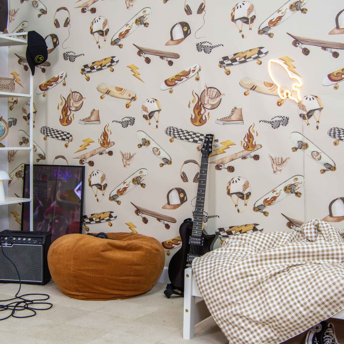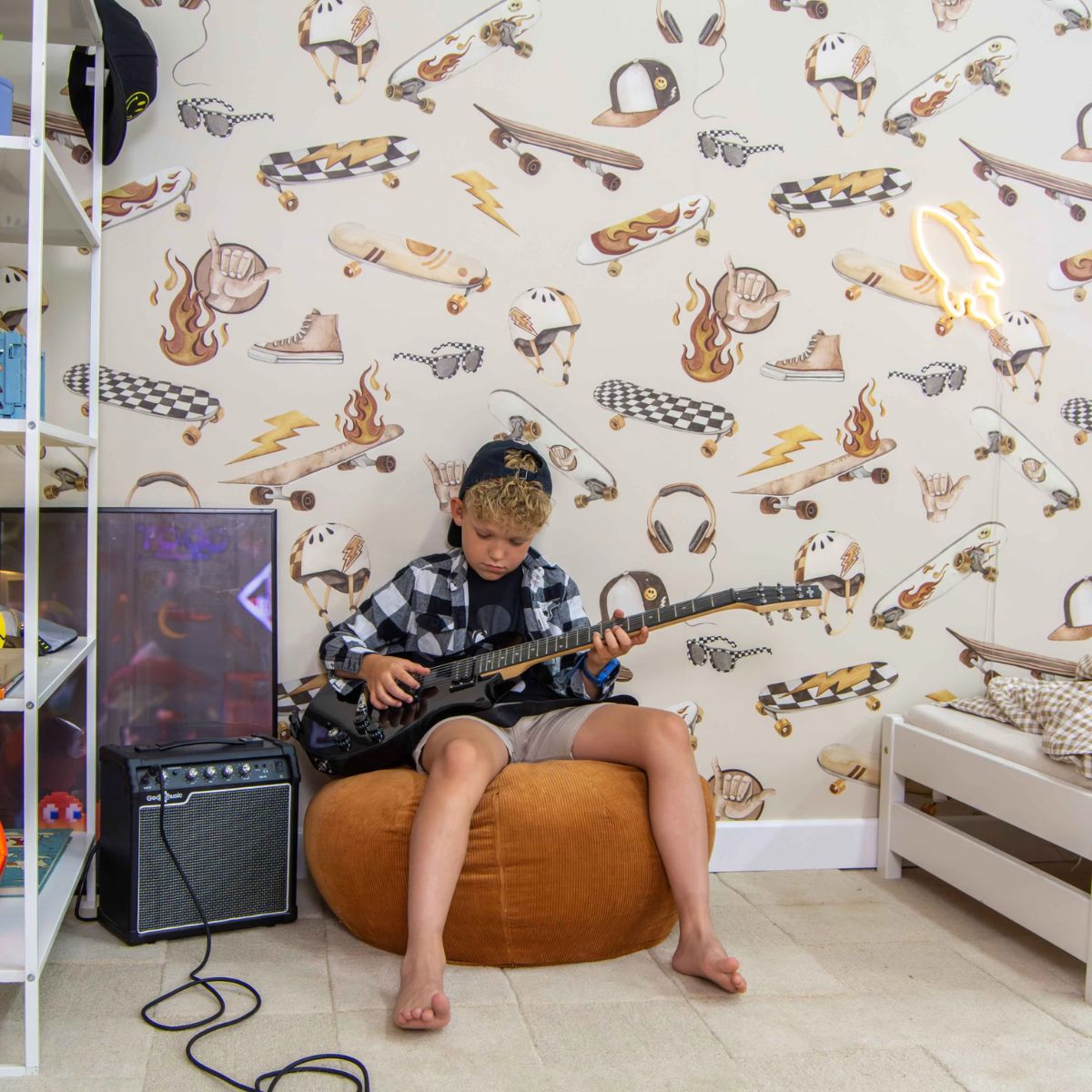 Tapeta dla chłopca Skate rewelacyjnie prezentuje się w pokojach urządzonych w stylu streetwear, industrialnym lub nowoczesnym. W zestawieniu z czarnymi akcentami, metalowymi regałami czy drewnianymi dodatkami tworzy spójną i charakterystyczną przestrzeń. Można ją wykorzystać jako wyrazisty akcent – np. za łóżkiem, przy biurku lub w strefie relaksu – albo pokryć nią wszystkie ściany, szczególnie w przestronniejszych pomieszczeniach.