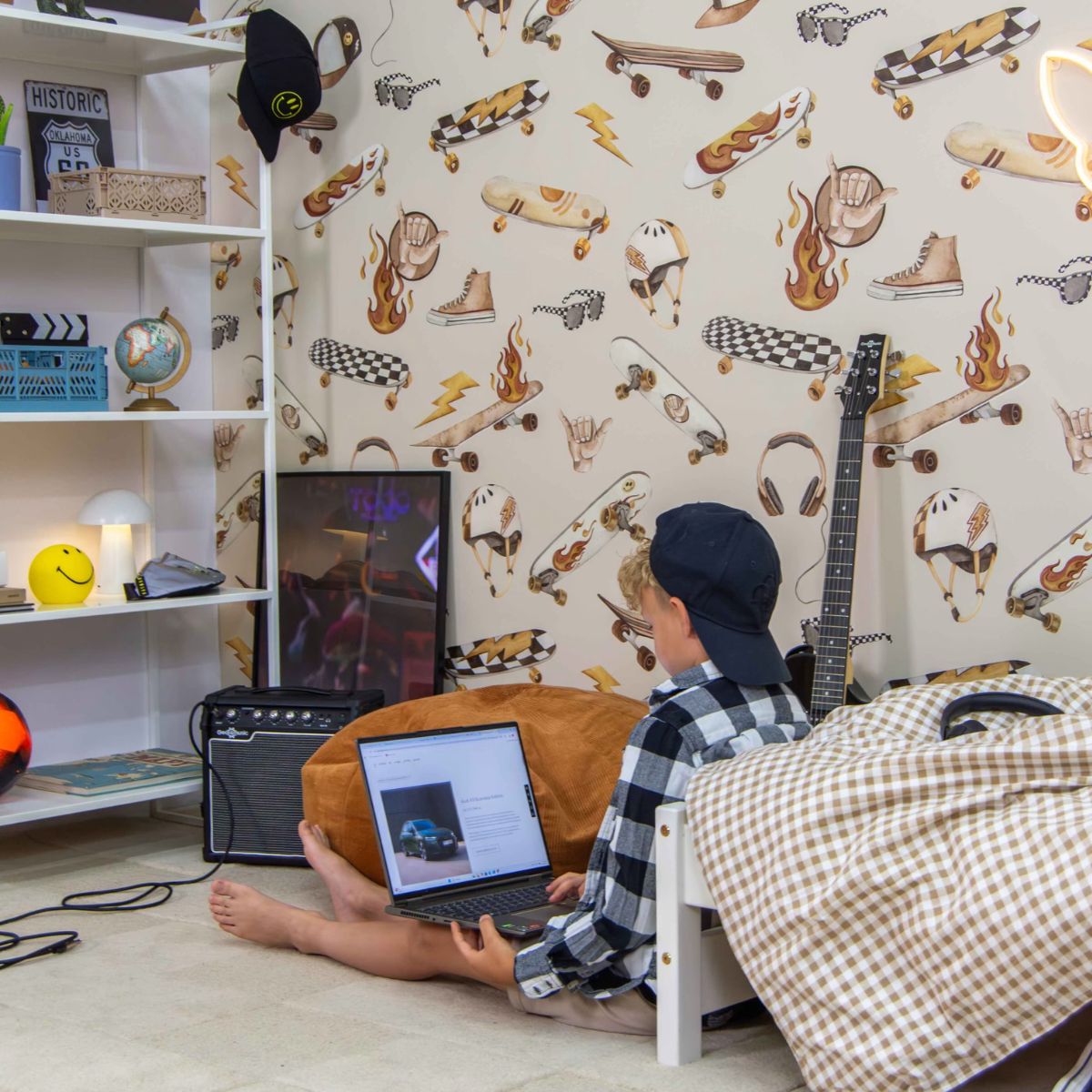 To propozycja, która nie tylko ożywia wnętrze, ale także inspiruje i dodaje mu energii – idealna tapeta do pokoju dziecka, które żyje w rytmie pasji i miejskiego stylu.