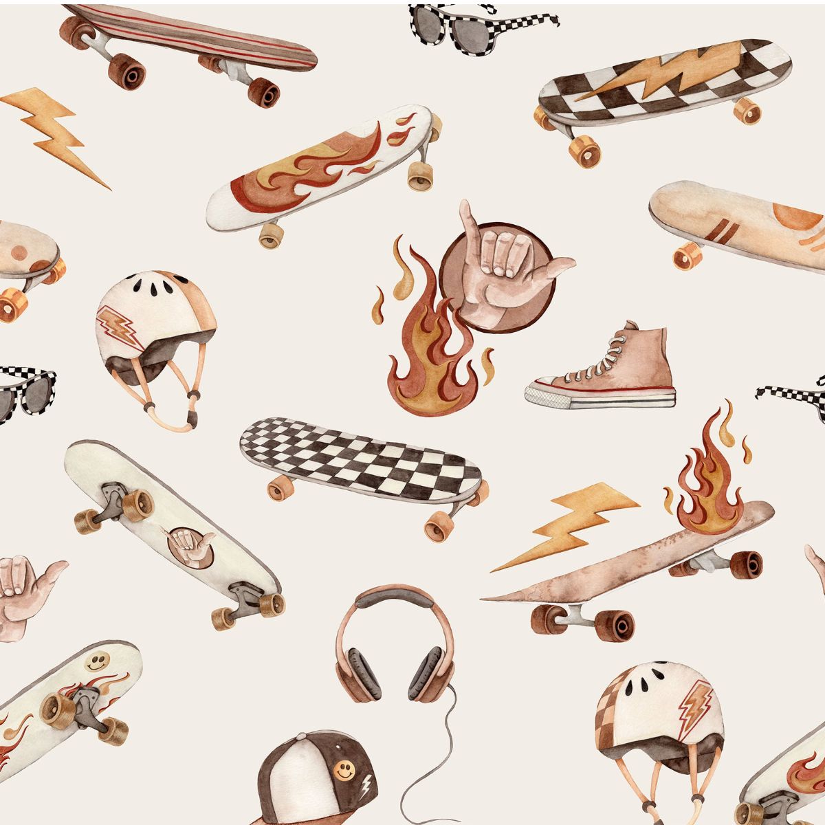 Biała tapeta Skate to świetna propozycja dla dzieci i nastolatków, które kochają aktywność, uliczny klimat i odrobinę szaleństwa. Dynamiczne motywy deskorolek, słuchawek, kasków, błyskawic i płomieni tworzą wyrazisty wzór, który tętni energią, a jednocześnie pozostaje estetyczny i uporządkowany. Jasne tło nadaje tapecie lekkości, optycznie powiększa przestrzeń i wprowadza do wnętrza świeżość oraz luz.