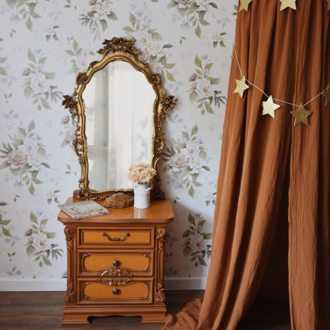 Tapeta Romantyczne Peonie to szybki i efektowny sposób na metamorfozę pokoiku dziecięcego. Będzie z pewnością subtelną dekoracją wnętrz w stylu angielskim czy shabby chic, a i ożywi aranżacje w stylu skandynawskim oraz glamour. Tapetę skąpaną w odcieniach bieli, błękitu, różu i zieleni warto zestawić z mebelkami z drewna i rattanu oraz dopełnić dodatkami w pastelowych kolorach