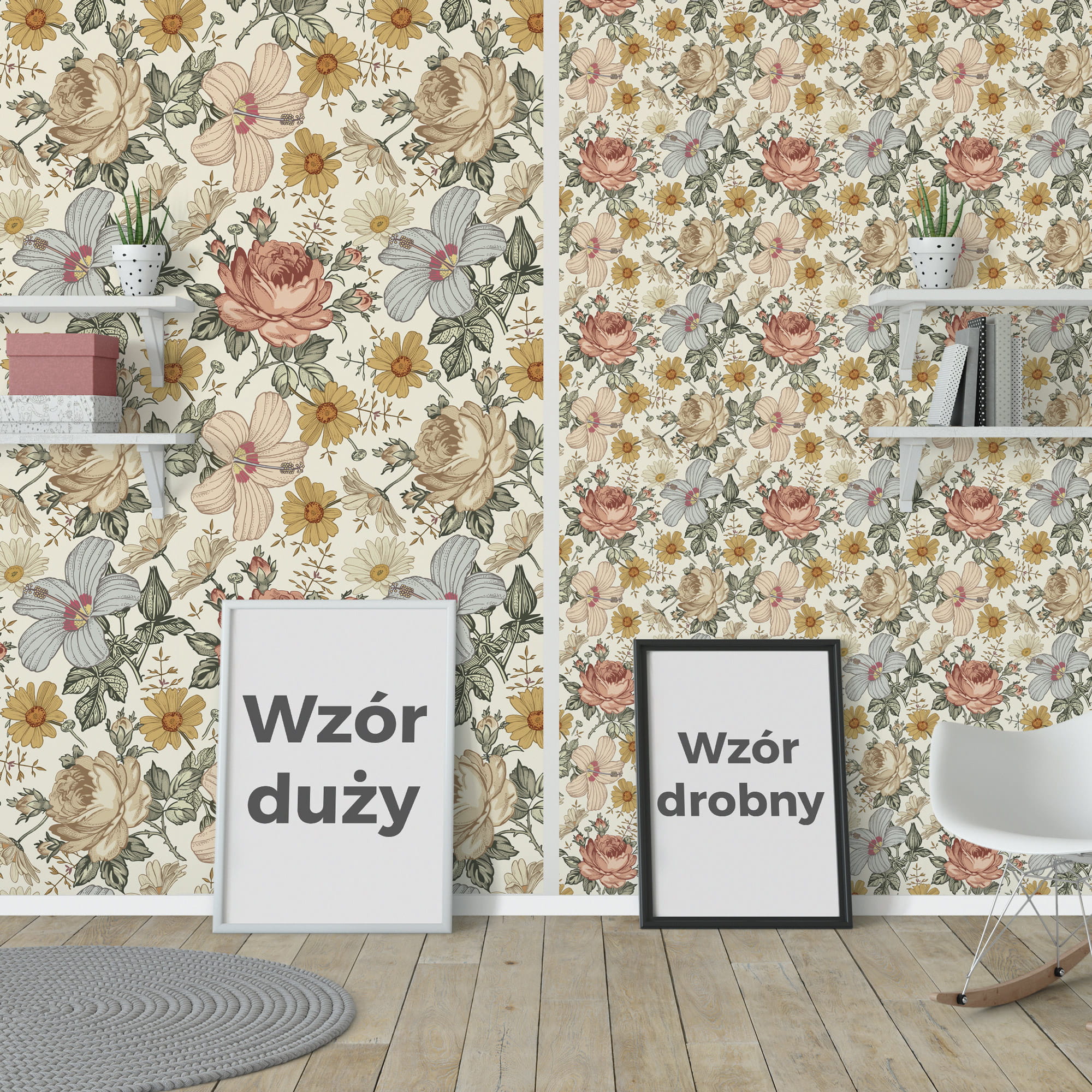 Możesz dokonać zakupu tapety w dwóch wariantach wielkości wzoru: wzór drobny oraz wzór duży. Różnią się one skalowaniem do podstawy wymiaru. Wzór drobny to skala 50cm podstawy, wzór duży to podstawa 100cm. Poglądowa wizualizacja wielkości wzoru drobnego oraz wzoru dużego na przykładzie tapety Kwiaty Vintage znajduje się w galerii produktu.