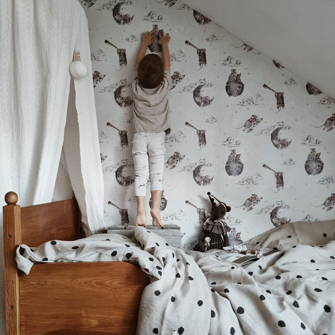 Tapeta z motywem kosmicznym występuje w trzech kolorach tła, sprawdzi się zarówno w pokoju dziewczynki, jak i chłopca. Tapetę warto połączyć z typowo kosmicznymi dodatkami. Będzie piękną bazą w pokoiku z zarówno jasnymi, jak i ciemnymi meblami. Można ułożyć ją zarówno na całej ścianie, jak i udekorować nią jej fragment, a resztę połączyć z lamperią lub pomalować.