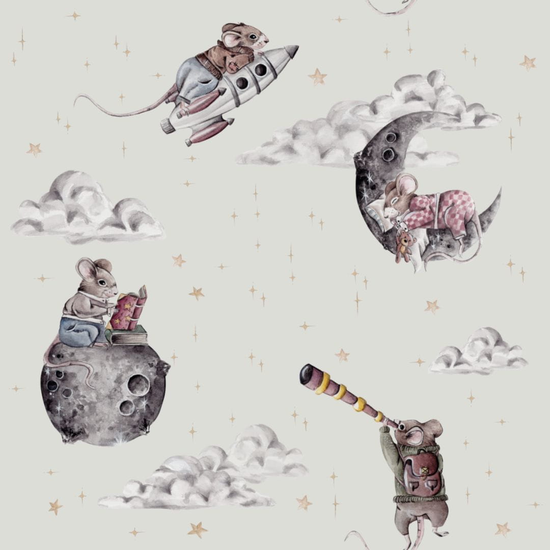 Tapeta Cosmic Little Mouse to opowieść o poszukującej przygód myszce, która tak bardzo pragnęła odkryć kosmos, że w końcu dopięła swego, zamknęła oczy, mocno zacisnęła pięści i…. w końcu się tam znalazła! Lata na myszkowej rakiecie, śpi na księżycu, obserwuje gwiazdy – to tylko niektóre z jej aktywności, o których chętnie posłucha każdy miłośnik astronomii.
