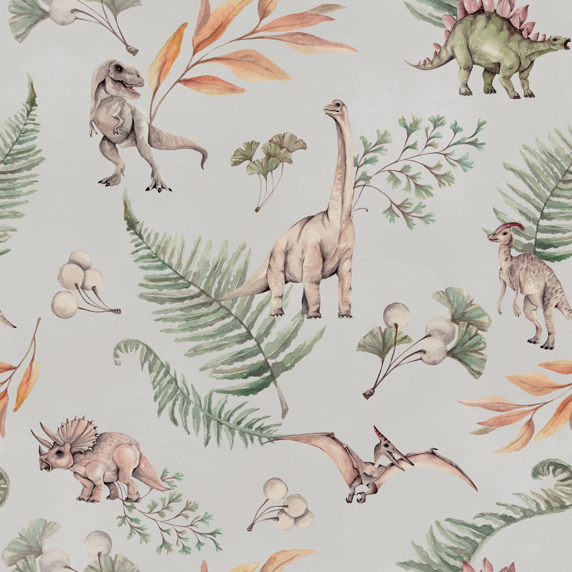 Tapeta Dinozaury została przedstawia najpopularniejsze prehistoryczne stwory – tyranozaur Rex, diplodok, triceratops, pterodaktyl oraz stegozaur. Połączenie dinków z roślinnym motywem tamtejszej przyrody pięknie urozmaici całość, nadając jej wyjątkowego charakteru.