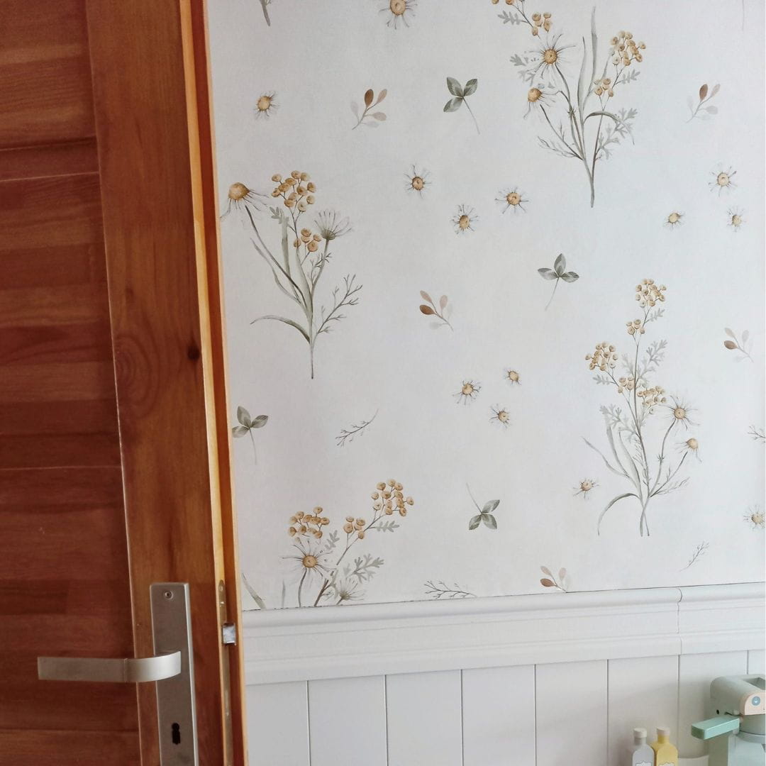 Tapeta Letnia Łąka – to wzór, który przywoła wspomnienie lata na beztroskiej, pachnącej ziołami łące. Delikatna kolorystyka idealnie wpasuje się w pokoik, w którym prym wiodą naturalne, drewniane meble oraz rattanowe dodatki. Tapeta posiada jasne, kremowe tło oraz przygaszone kolory roślin, dzięki czemu polecana jest zarówno do mniejszych (pięknie je rozświetli), jak i większych wnętrz.