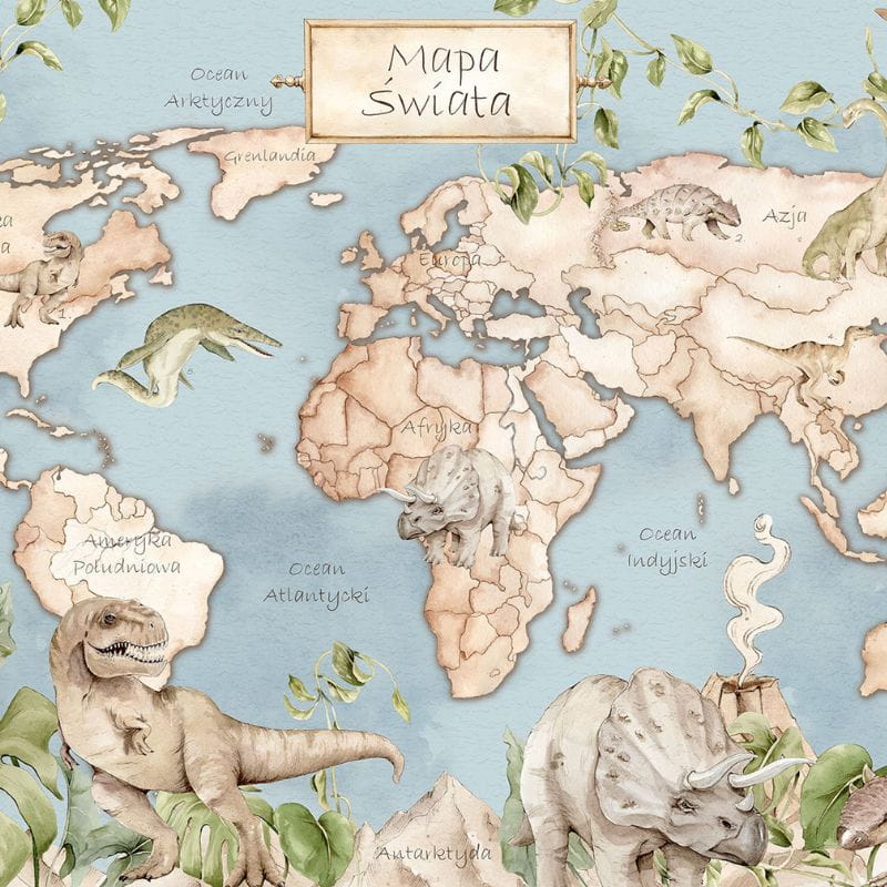 Tapeta mapa świata z dinozaurami zachęci Twoje dziecko do odkrywania najdalszych zakamarków planety – w rzeczywistości i w wyobraźni. Przywoła też wspaniałe wspomnienia z odbytych już wypraw, a i zainspiruje do układania ciekawych planów na wakacje. Przy okazji będzie stanowić zaproszenie do przyjrzenia się fascynującym, prehistorycznym stworzeniom – i to we własnym pokoju!