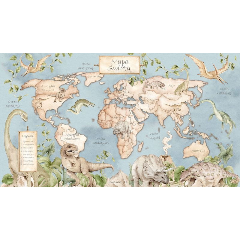 Tapeta mapa świata z dinozaurami Dekorillo - prehistoryczny pokój dziecka