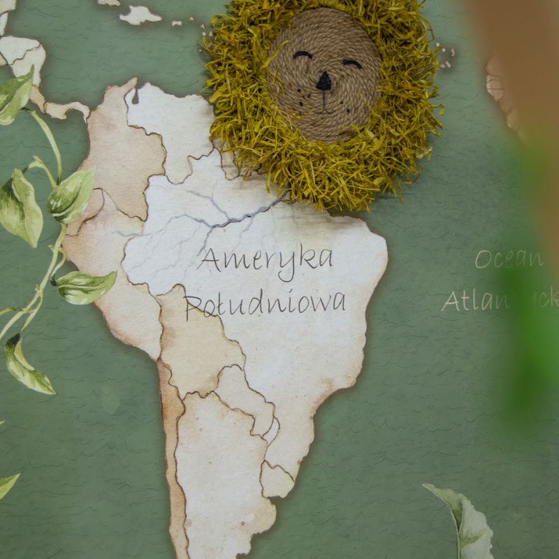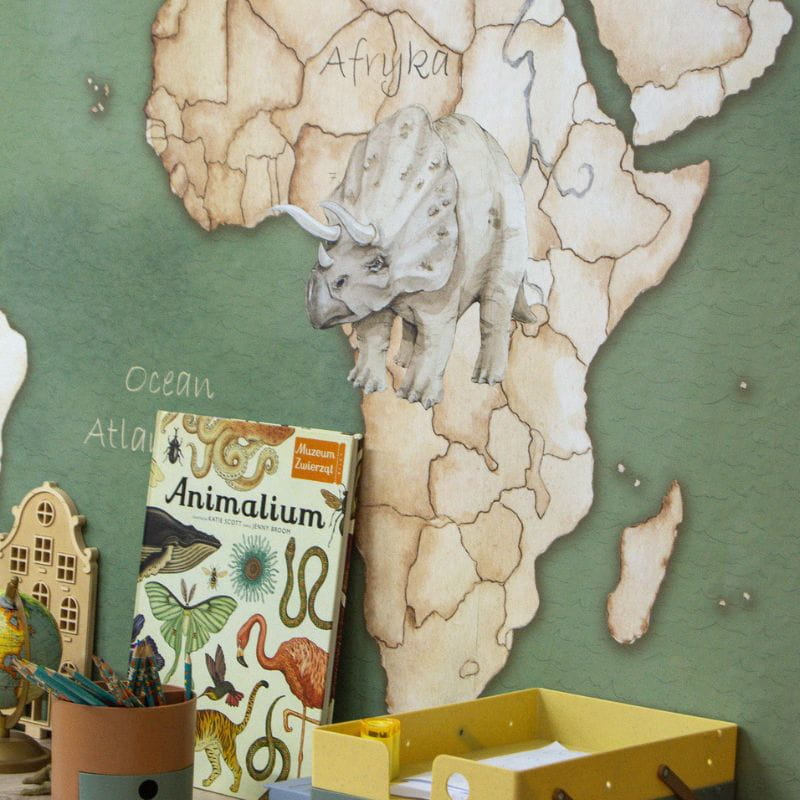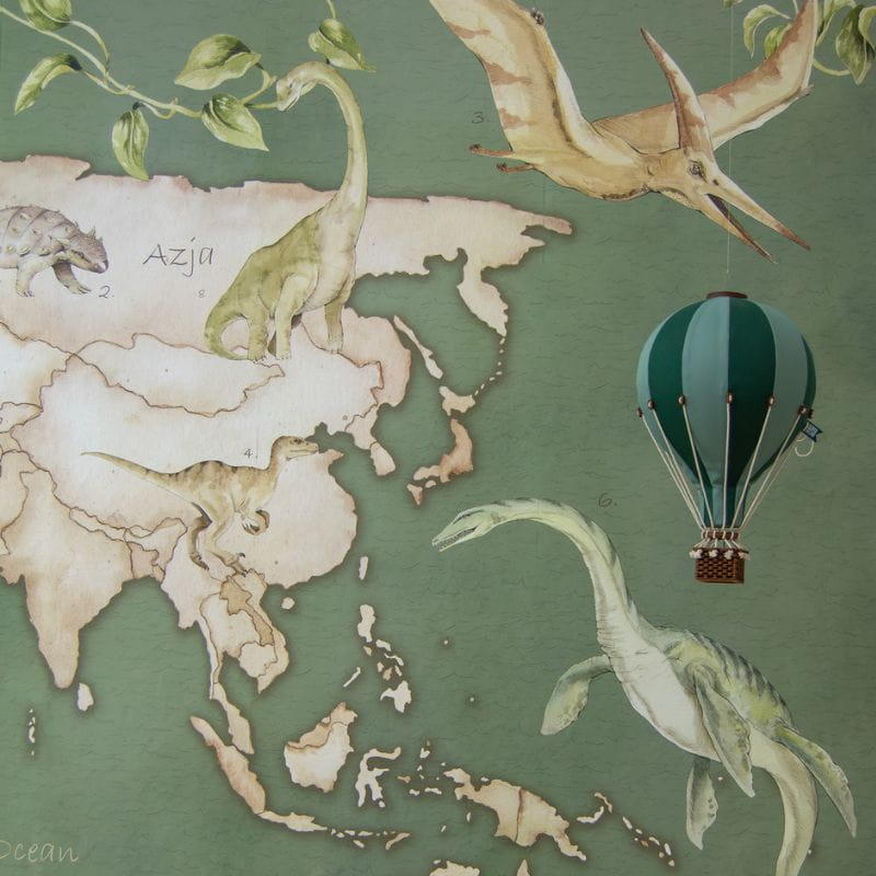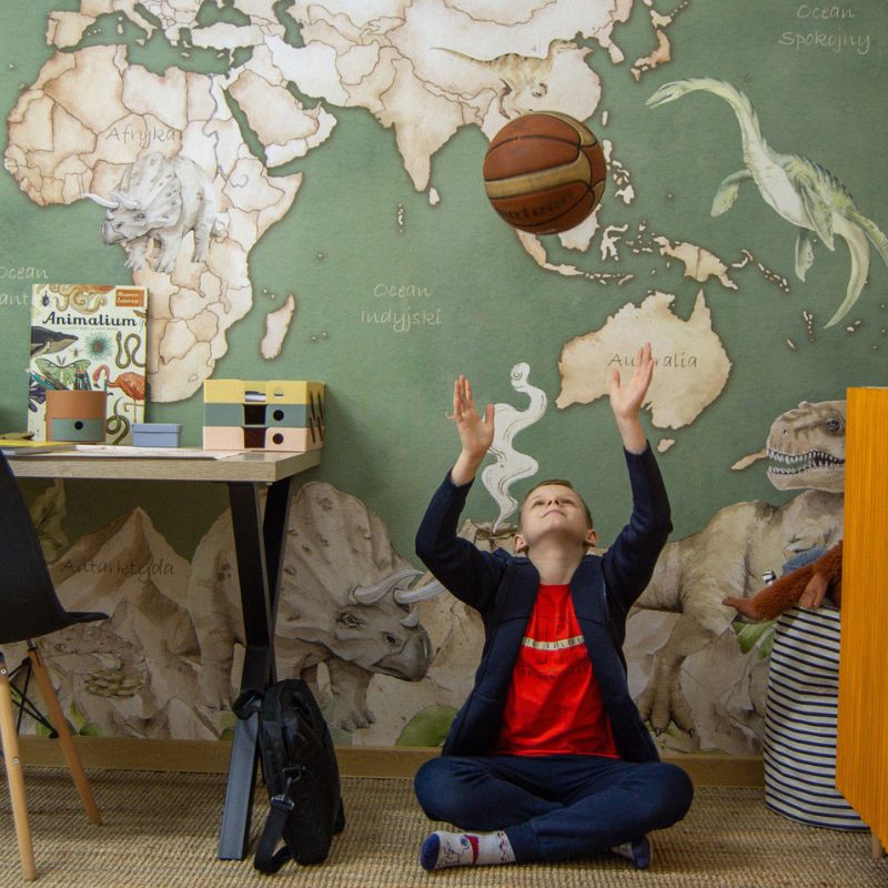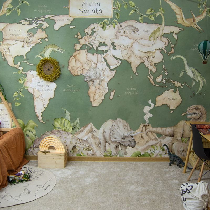 Zielona tapeta mapa świata do pokoju dziecięcego świetnie zda egzamin we wnętrzach z dinozaurami w roli głównej. Będzie wspaniałą dekoracją w utrzymanych w zieleni pokoikach urban jungle, a jednocześnie ożywi wnętrza w stylu boho. Pozwoli też cofać się wyobraźnią do czasów prehistorycznych w aranżacjach typu vintage – wielkie gady będą tam jak najbardziej mile widziane.