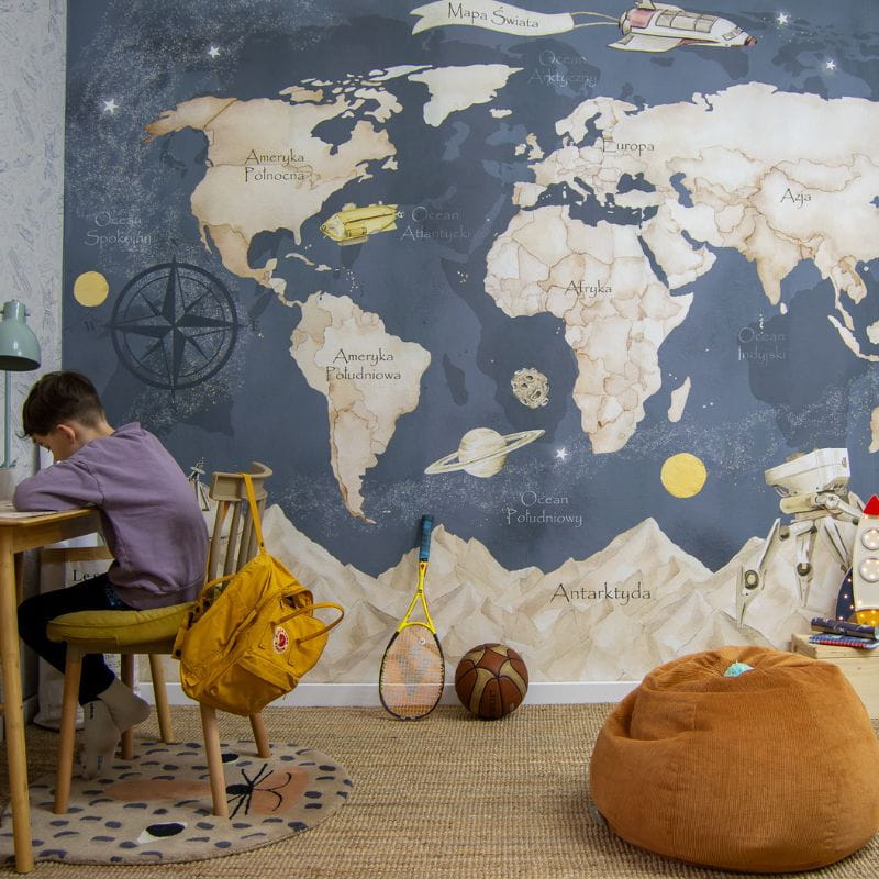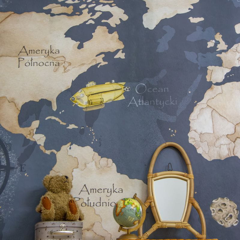 Dzięki temu, że tapety przygotowujemy pod wymiar ścian, mural z mapą świata będzie świetnie wyglądał także w zestawieniu z boazerią lub lamperią.