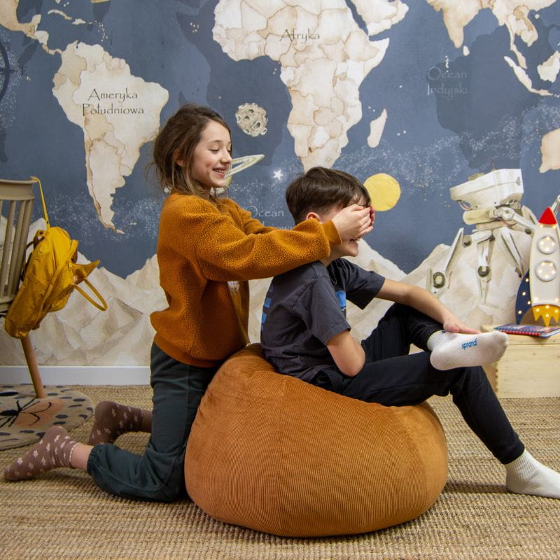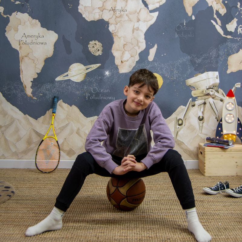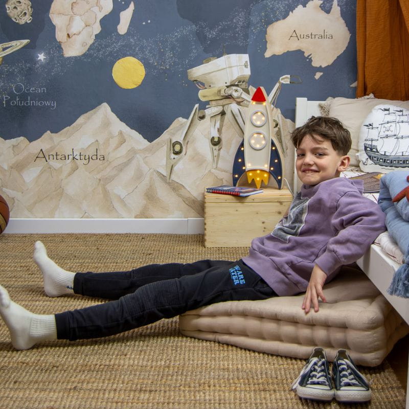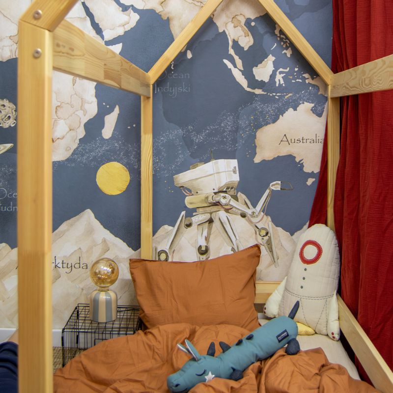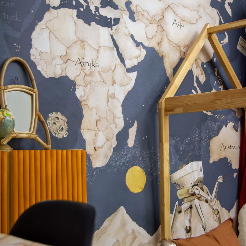 Tapeta mapa świata z kosmosem będzie strzałem w dziesiątkę, jeśli urządzasz pokoik z tym motywem w roli pierwszoplanowej. A daje on ogromne możliwości aranżacyjne. Co więcej, sprawdzi się ona również na jednej ścianie we wnętrzach skandynawskich. Będzie rozbudzać wyobraźnię i zachęcać do sięgania wyżej także w sypialniach vintage.