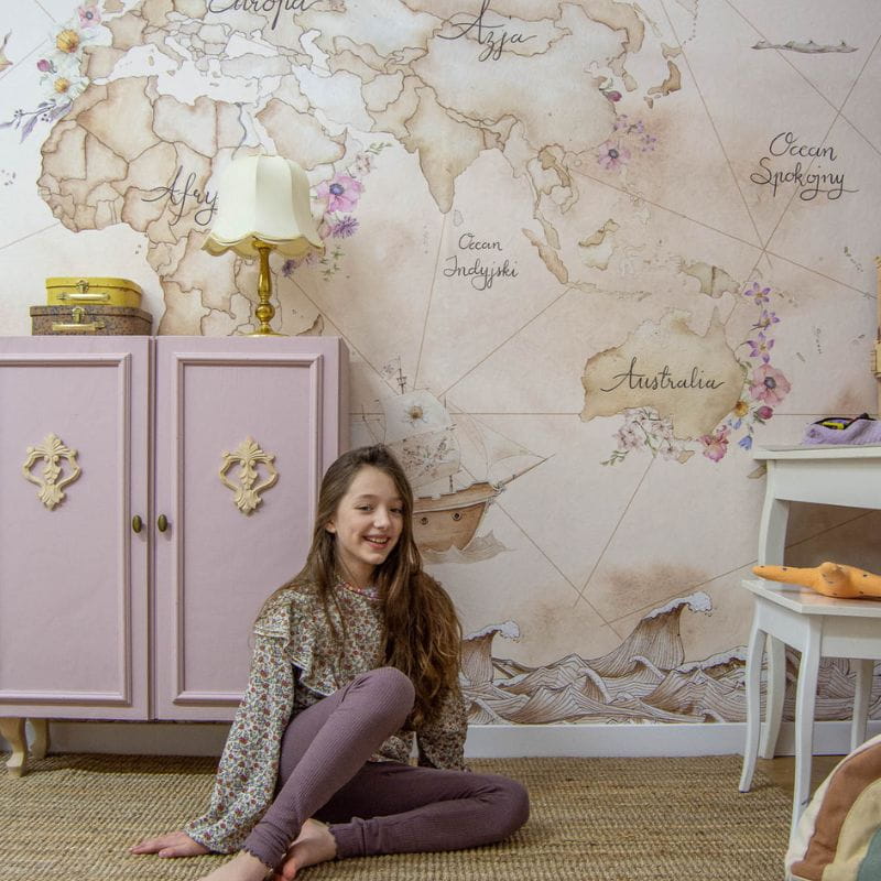 Tapeta z mapą świata wypełni dziewczęcy pokój urokliwymi kolorami. Pozwoli przekształcić zwykły pokoik w wyjątkową przestrzeń – niezależnie od tego, czy urządzisz go w stylu romantycznym, vintage czy też glamour. Pięknie zaprezentuje się ona w połączeniu m.in. z różowymi girlandami, lustrem przypominającym słońce oraz modnym baldachimem.