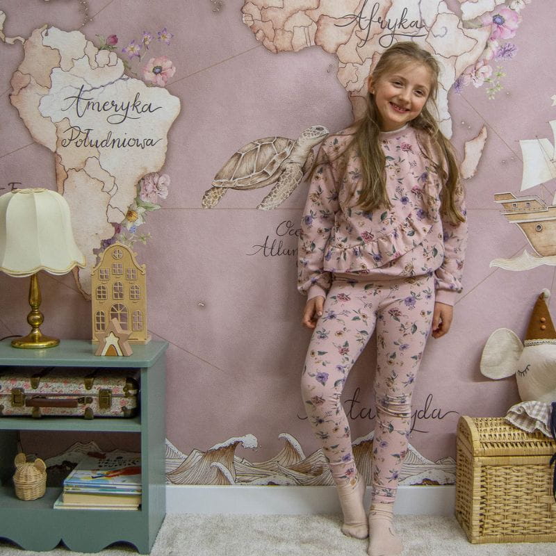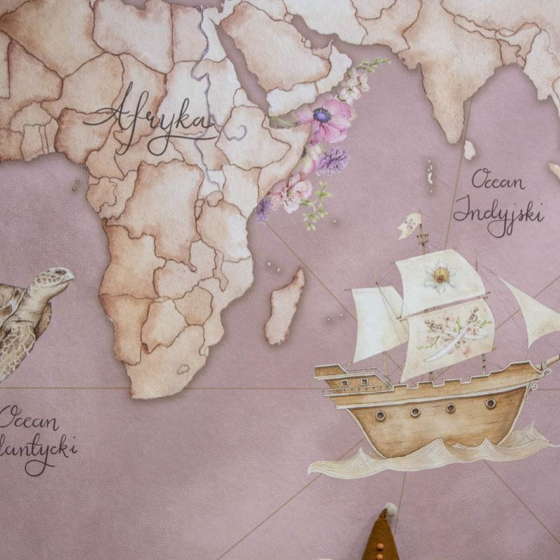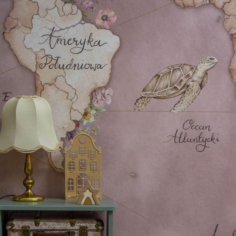 Różowa tapeta mapa świata doskonale spisze się we wnętrzach w stylu podróżniczym. Jeśli dobierzesz do niej globus w stylu retro, ozdobne kufry podróżne (w których można przechowywać zabawki) oraz mebelki z drewna lub rattanu, całość będzie prezentowała się wspaniale. Oczywiście mile widziane są w takich aranżacjach zdjęcia oraz pamiątki z fascynujących wojaży!