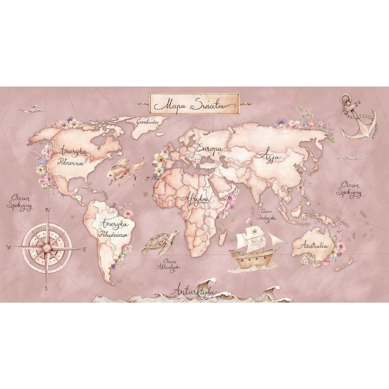 DEKORILLO - TAPETA DZIECIĘCA MAPA ŚWIATA MORSKA RÓŻOWA