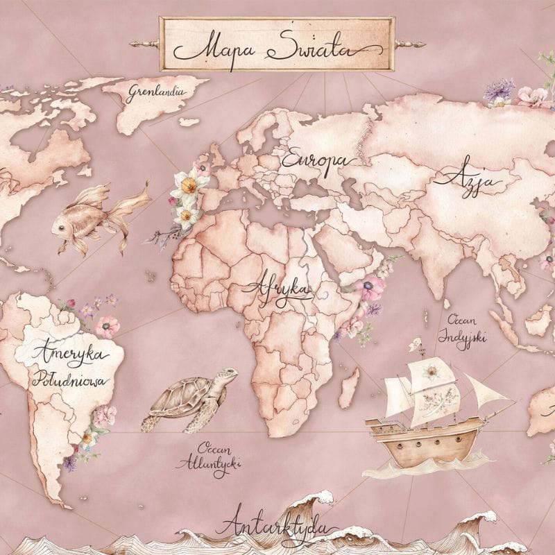 Twoja córeczka marzy o odkrywaniu różnych zakątków planety? Pozwól jej na to i wybierz naszą tapetę-mapę świata, która rozbudzi jej ciekawość, a jednocześnie będzie świetnym tłem dla wielu zabaw – również tych edukacyjnych. Afryka, a może jednak Australia? Dzięki tej mapie może ona przebywać praktycznie wszędzie!