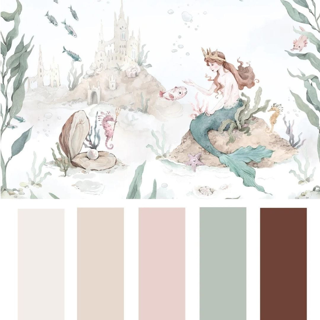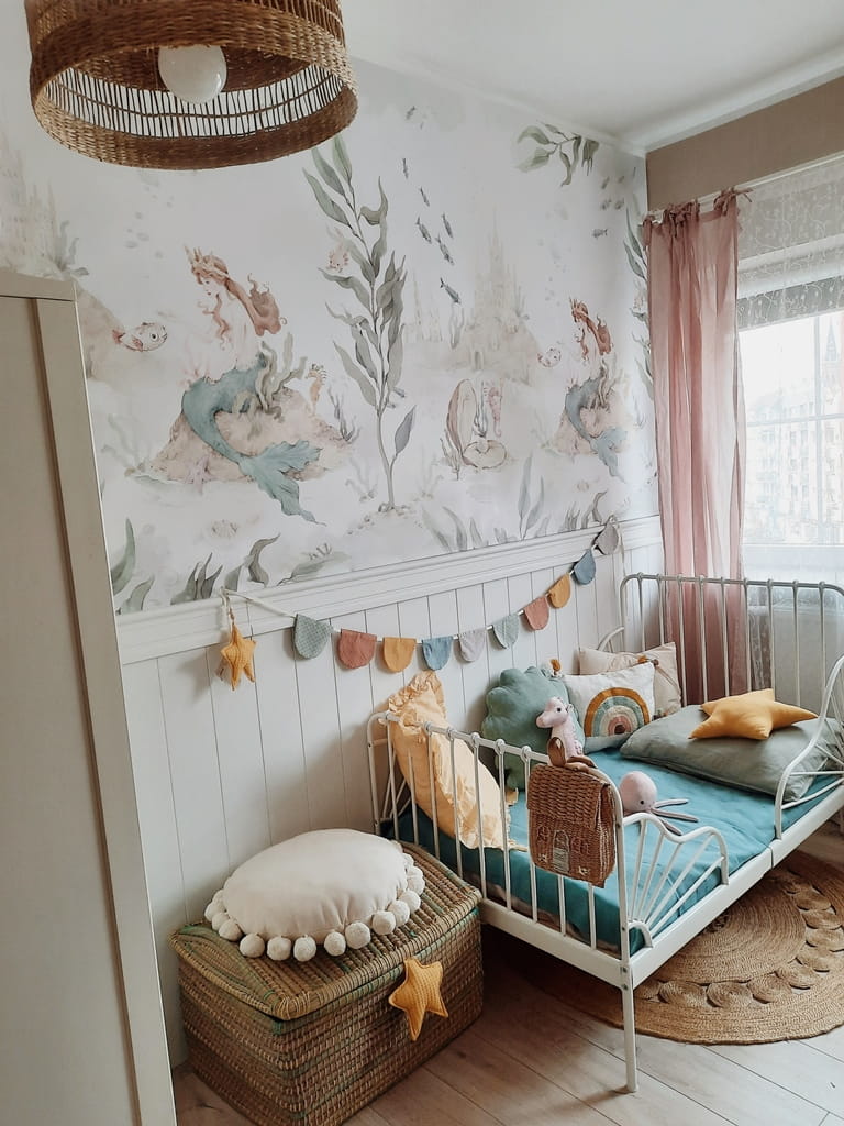 Tapeta do pokoju dziewczynki Dekorillo przedstawia królewską magię. Jest Syrenka-księżniczka i jej potężny zamek, strażnik konik morski, i oczywiście mnóstwo delikatnych rybek! Tapeta w formie murala, wyróżnia się ogromną dbałością o detale oraz łagodną paletą barw. Będzie doskonale komponować się zarówno na całej ścianie, jak i w połączeniu z lamperią. Jesteśmy pewni, że spodoba się wszystkim mniejszym i większym księżniczkom.