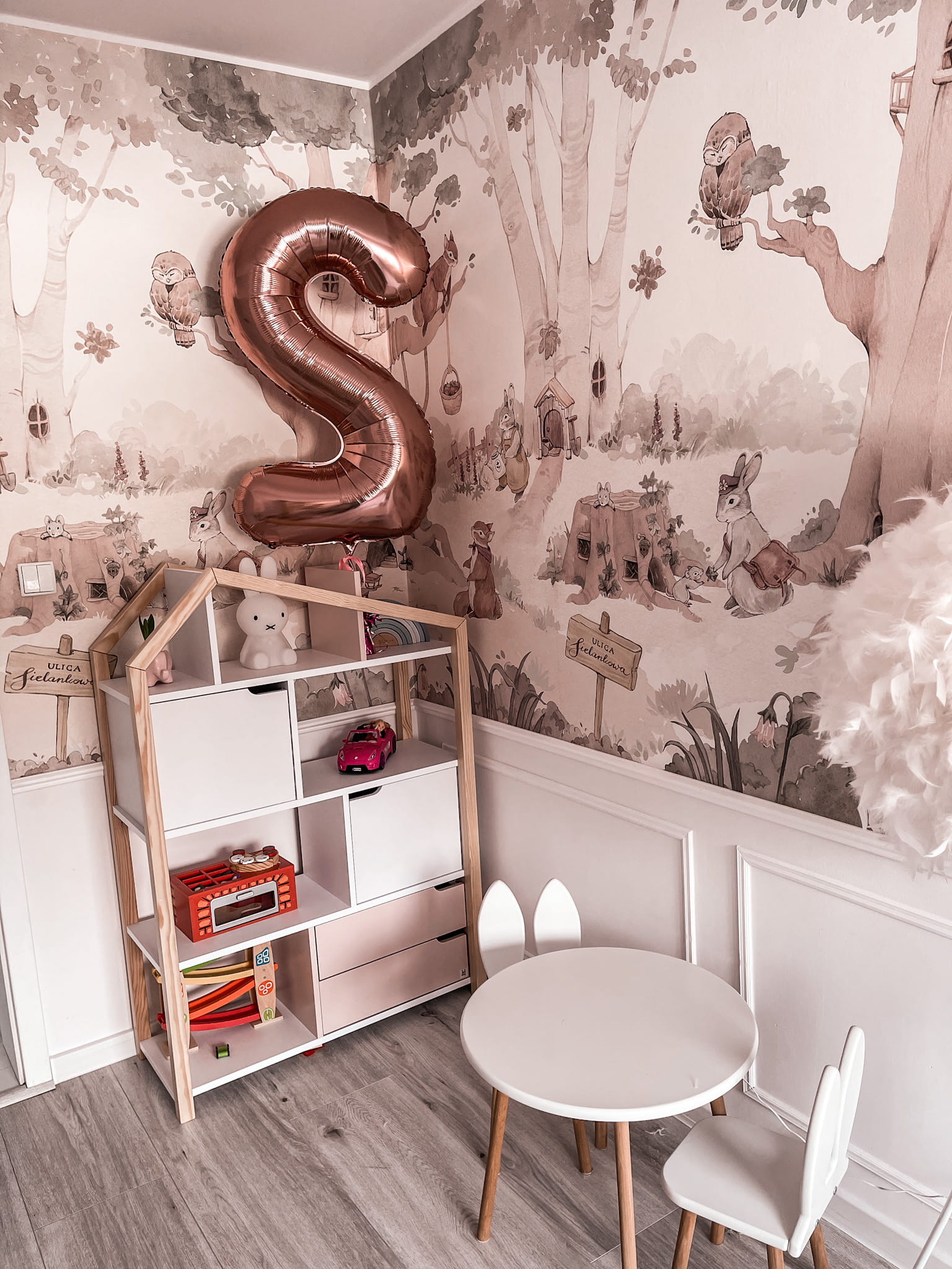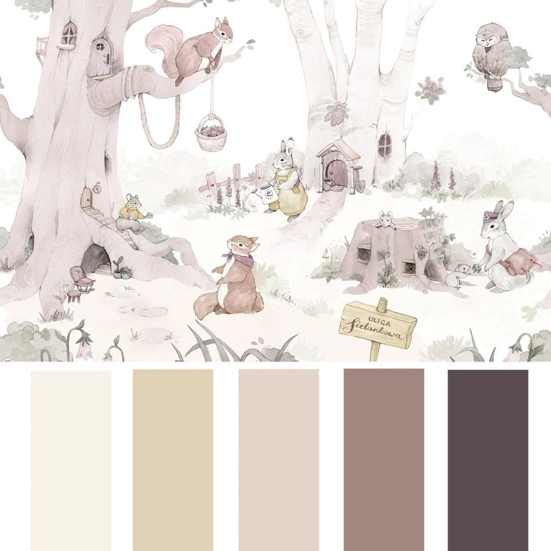 Mieszkańcy ulicy Sielankowej upodobali sobie aranżacje w stylu leśnym i rustykalnym. To właśnie one pozwalają wnieść do małych pokoików trochę świeżości i natury. Tapeta świetnie komponuje się z modnym tipi, krzesełkami z oparciami w kształcie zwierzątek, wiklinowymi koszami czy też stylowymi pudełkami z drewna. Pięknie wygląda również w towarzystwie naturalnych dekoracji z szyszek, kasztanów czy też żołędzi.