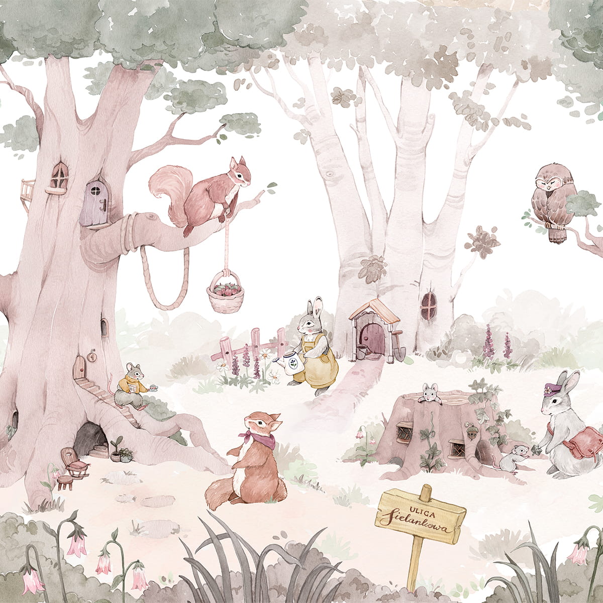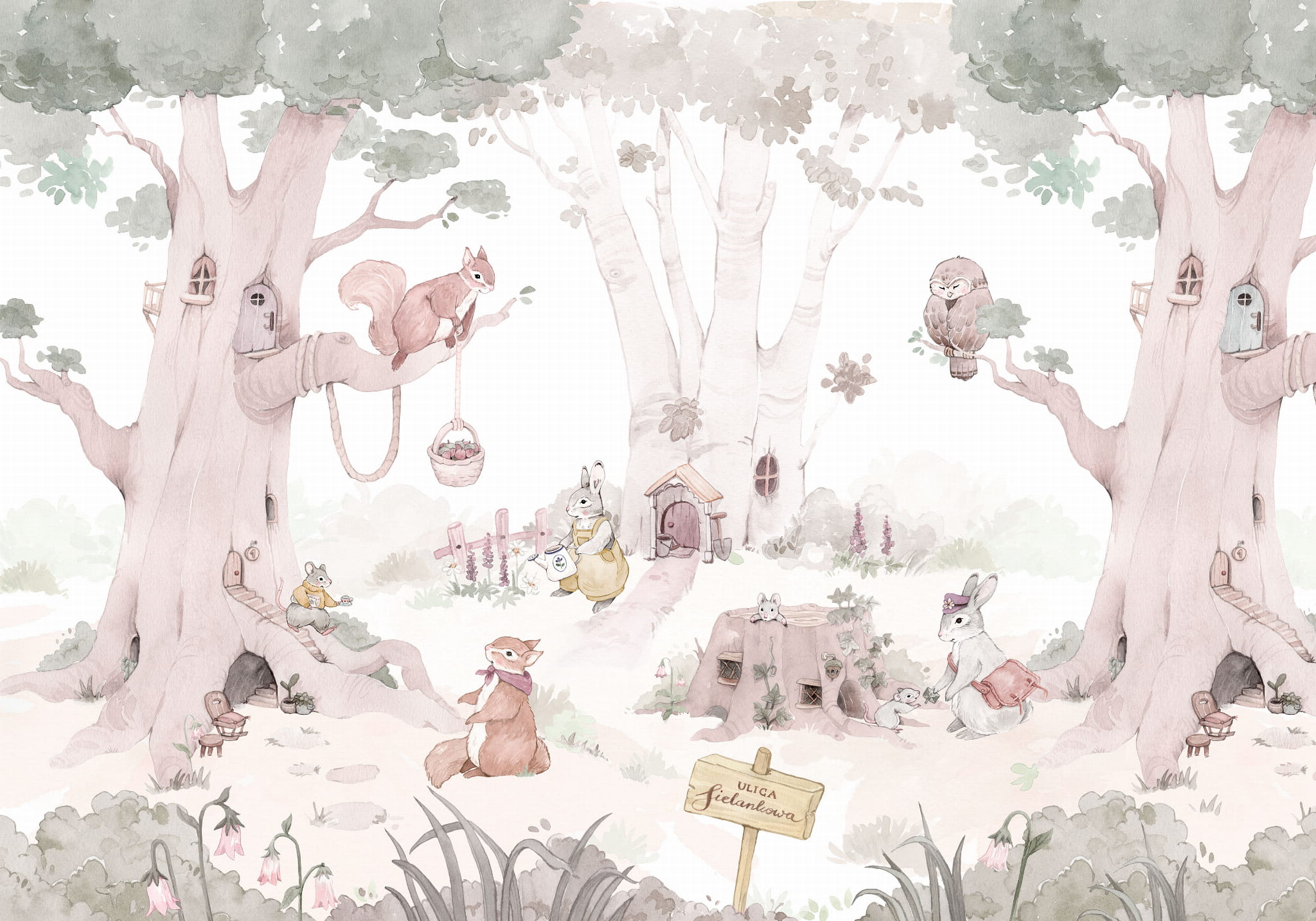 Tapeta leśna przedstawia scenkę, gdzie panuje radość, spokój i bezpieczeństwo. To również ulubione miejsce zabaw dzieci, w którym mogą rozwijać kreatywne myślenie oraz wspólnie z rodzicami czytać ulubione bajki. Tapeta wyróżnia się ogromną dbałością o detale oraz przyjazną, łagodną paletą barw.