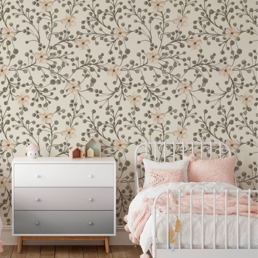 Oto tapeta, która pozwoli poczuć się jak w XIX-wiecznej powieści lub baśniowym gaju. Zastosowano w niej lekko kremowe odcienie kwiatów, kontrastujące z szarością gałązek. Kwiatowy wzór przywołuje skojarzenia z epoką romantyzmu, kojarzącą się z nostalgią i nastrojowością. To idealny motyw dla prawdziwej marzycielki.