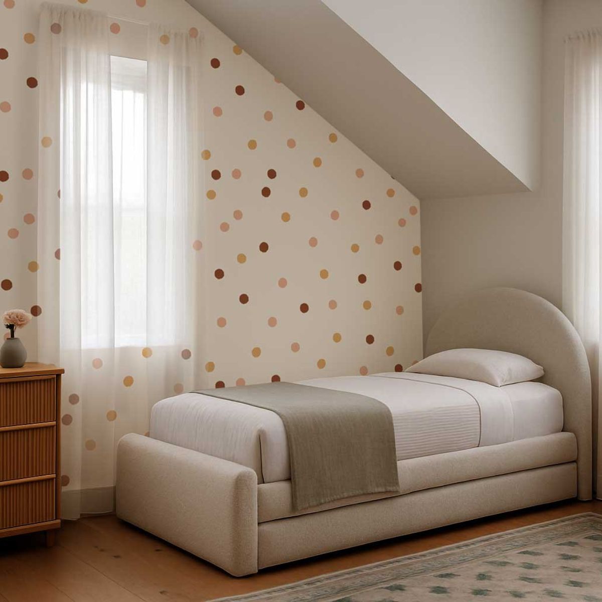 Tapeta Bouncy Dots pięknie prezentuje się w połączeniu z naturalnymi tkaninami i minimalistycznymi dodatkami. Idealnie dopełni wnętrza inspirowane estetyką skandynawską lub retro, tworząc przestrzeń pełną ciepła, prostoty i dziecięcej radości.