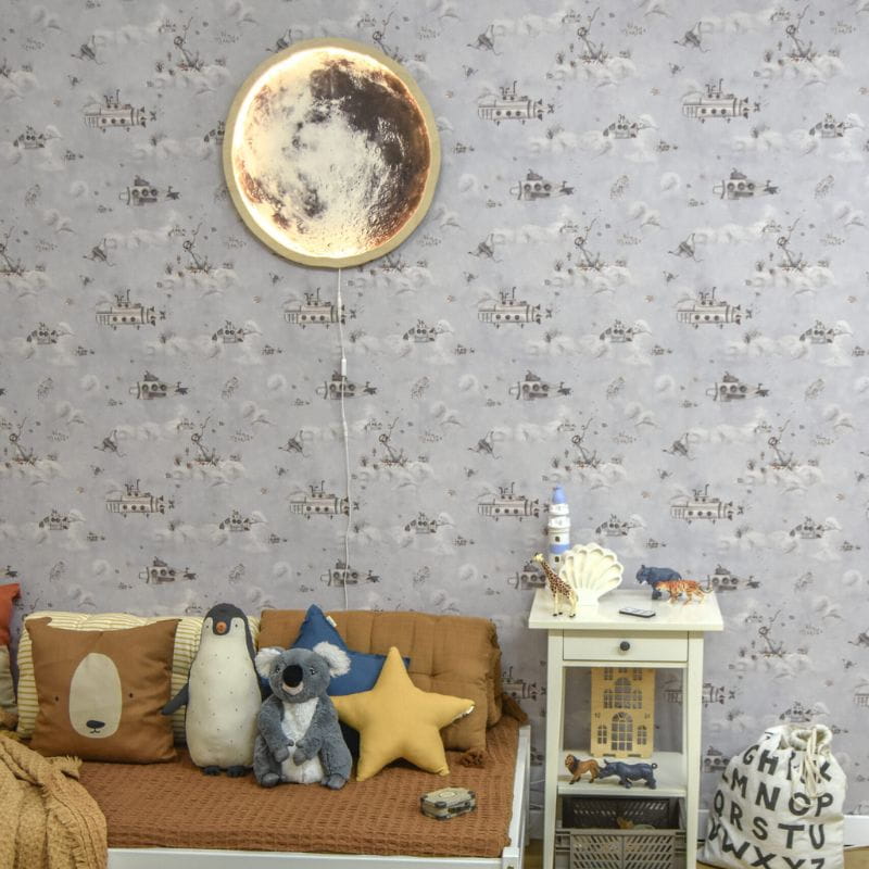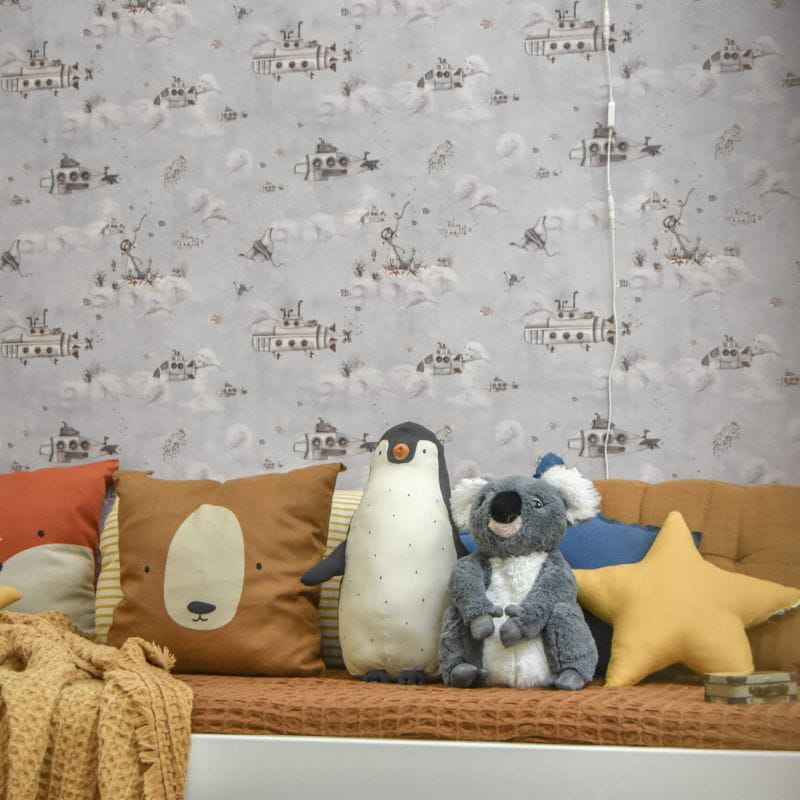 Tapeta w łodzie podwodne będzie pasować jako tło chłopięcego pokoju, zarówno aplikując ją na całą ścianę, jak i zestawiając z lamperią. Pozostałe ściany warto utrzymać w delikatnej, jednolitej tonacji. Tapeta będzie pięknie wyglądać z drewnianymi oraz białymi mebelkami.