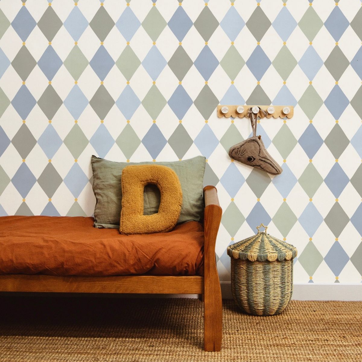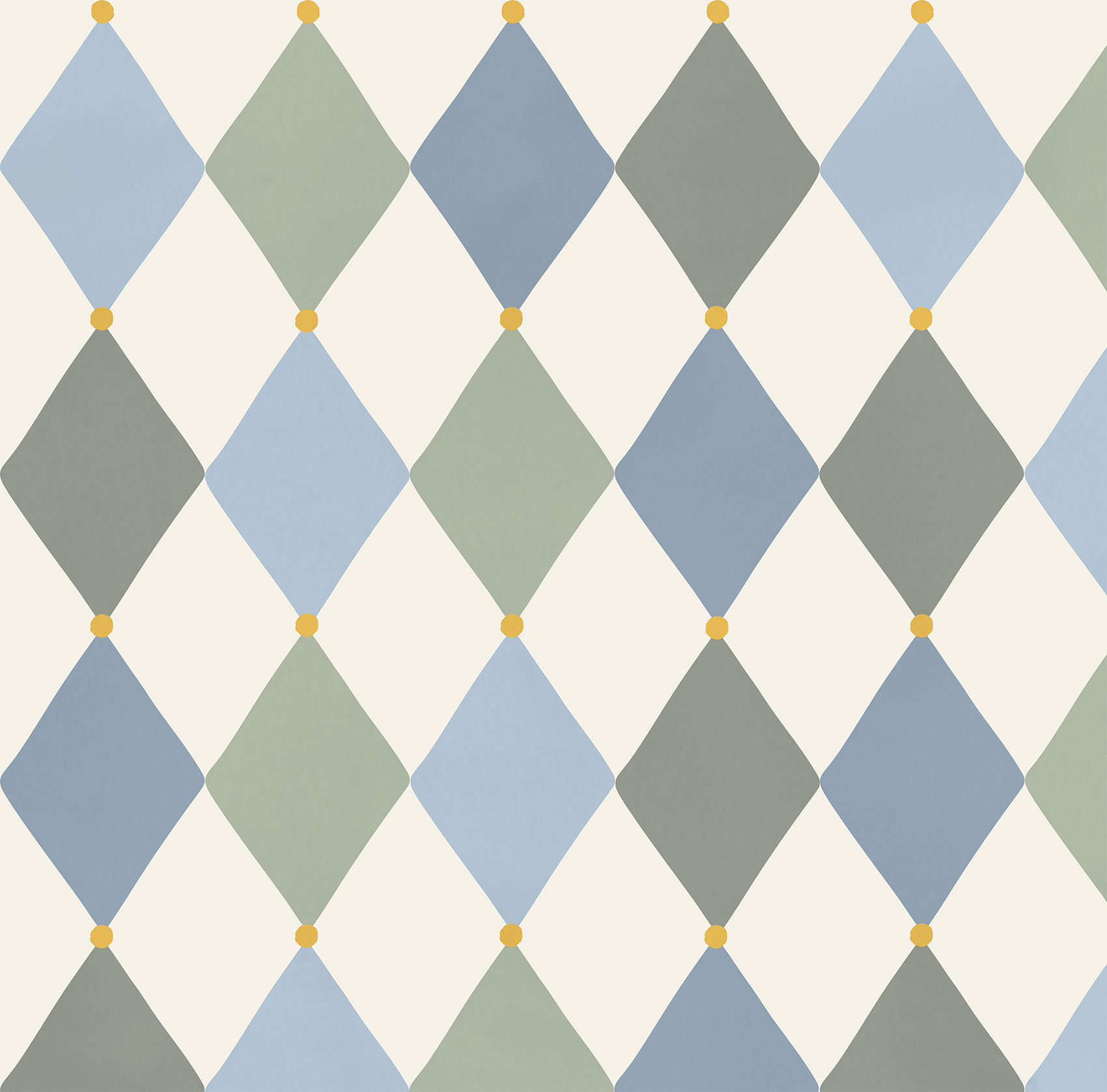 Tapeta w niebieskie romby z kolekcji Tiny Parade to harmonijne połączenie odcieni błękitu, kremu i oliwki, tworzących spokojną, klasyczną kompozycję. Wzór inspirowany motywem harlekina w nowoczesnym wydaniu wnosi do wnętrza rytm, lekkość i subtelny, elegancki charakter.